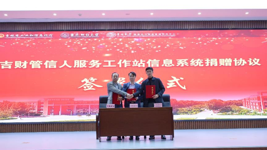 长春市青少年发展基金会秘书长卢火旺、吉数研院执行副院长张宝学、Beat365中文官方网站管理科学与信息工程学院院长姜建华三方共同签署了“吉财管信人服务工作站软件系统”捐赠协议。