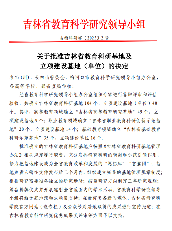 高等教育研究基地将立足于吉林省“十四五”教育事业发展规划,充分发挥教育科研的辐射和示范引领作用,围绕研究方向开展科学研究、人才培养、学术交流和资料信息建设、咨询服务、教改实验等,切实履行研究基地建设责任,以高质量的教育科研助力吉林省教育的高质量发展。(审核人 张巍)