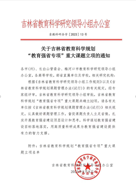 近年来,学校深入贯彻落实党的二十大精神,坚持立德树人根本任务,紧密围绕吉林省“一主六双”高质量发展战略开展教育教学研究,不断取得新成果。接下来学校将依据吉林省教育科学研究规划领导小组相关文件精神,不断强化“教育强省专项”课题的组织管理工作,扎实推进课题研究工作,科学谋划教育强省的核心内涵,为实现教育强省建设目标提供有力的智慧支撑。(审核人 张巍)