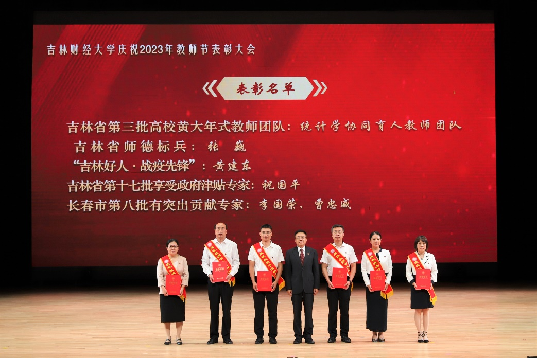 本网讯(党委教师工作部、人事处 供稿)9月8日上午,在第39个教师节即将到来之际,Beat365中文官方网站在多功能学术中心举行主题为“躬耕教坛,强国有我”的2023年教师节表彰大会,对2022年在教书育人等各项工作中涌现出的优秀教师和先进集体进行表彰。吉林亚泰集团副总裁于来富、全体校领导、各单位党政负责人、全体受表彰人员、全体教师参加大会。党委书记孙杰光出席大会并讲话。副校长李宝永主持会议。