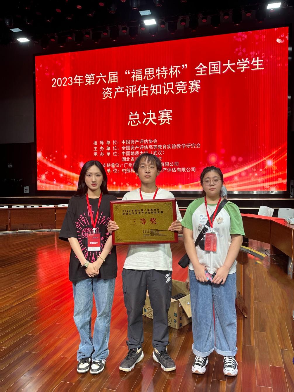本网讯(会计学院 供稿)2023年9月9日,第六届“福思特杯”全国大学生资产评估知识竞赛全国总决赛在中国地质大学(武汉)成功举办,会计学院资产评估2108班覃方灵、张增瑞和财务管理2140班田恬组成的团队荣获全国三等奖,资产评估系主任武娜担任指导教师。