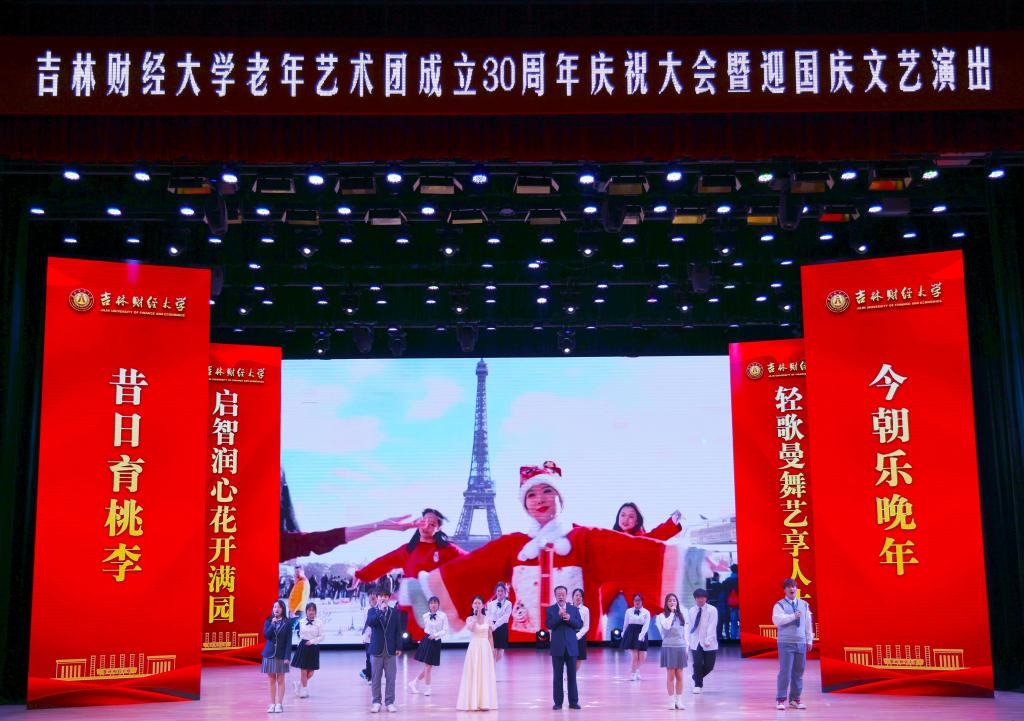在欢快的掌声中,离退休教师时雨田、公共管理学院在职教师赵紫薇以及来自会计学院和国际交流学院的同学们带来了歌曲联唱《同桌的你》《年轻的朋友来相会》《相亲相爱》,老中青三代再次相会,同台演出,诠释吉财人从未褪色的感情。