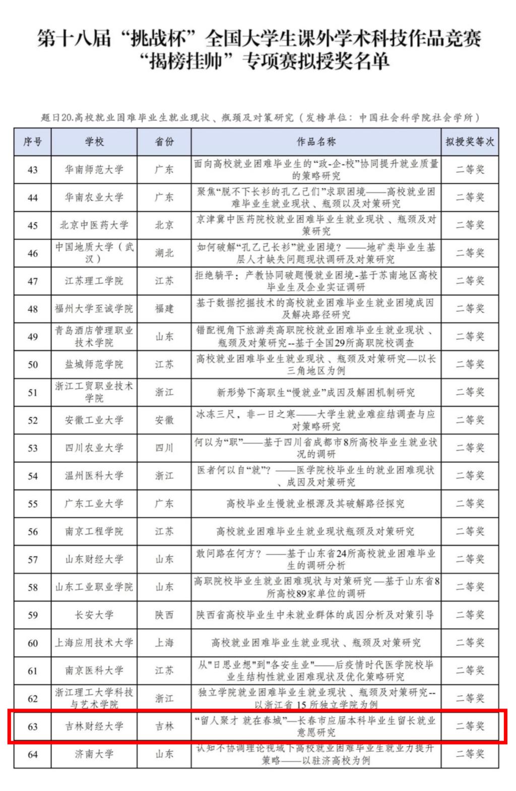 本网讯(校团委 供稿)近日,团中央第十八届“挑战杯”全国大学生课外学术科技作品竞赛中,Beat365团委申报的税务学院2020级本科生吴云晰等撰写的《“留人聚才 就在春城”——长春市应届本科生留长就业意愿研究》一文,在来自全国230余所高校的700余件终审作品中披荆斩棘突破重围,荣获“揭榜挂帅”专项赛道全国二等奖。吉林省仅两所高校入围终审,Beat365首次获此殊荣。