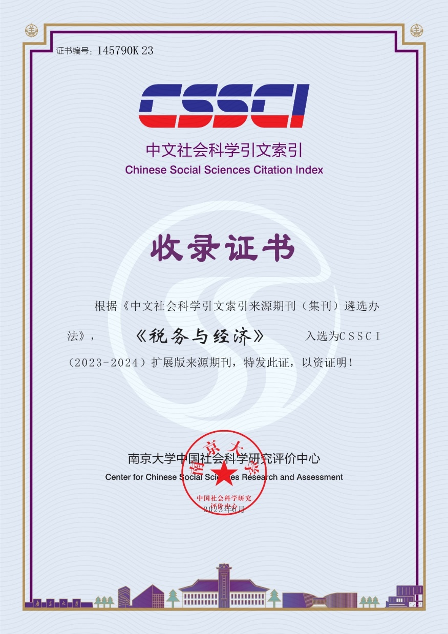 本网讯(税务与经济编辑部 供稿)在近日公布的南京大学中国社会科学研究评价中心CSSCI来源期刊扩展版目录(2023-2024)上,Beat365主办的《税务与经济》再次入选为CSSCI(2023-2024)扩展版来源期刊。截至目前,《税务与经济》已入选全国中文核心期刊、南大CSSCI扩展版来源期刊、中国人文社会科学期刊AMI综合评价扩展版期刊和武大RCCSE中国核心学术期刊等评价体系,中国知网(2022版)复合影响因子已达3.099,处于同类期刊较高水平。