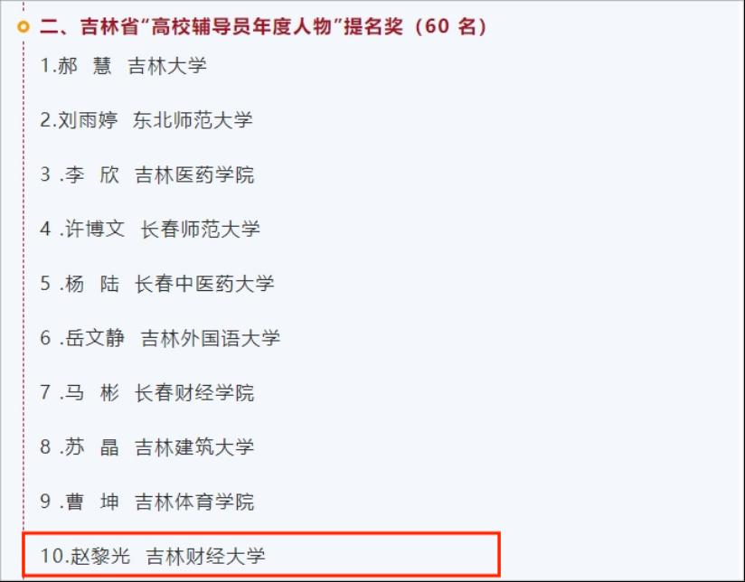 本网讯(党委学生工作部 供稿)近日,吉林省教育厅网站公示了2023年吉林省“高校辅导员年度人物”推选展示活动评选结果。根据《关于开展2023年吉林省“高校辅导员年度人物”推选展示活动的通知》(吉教思政〔2023〕14号)精神,经学校推荐、专家评审,评选出2023年吉林省“高校辅导员年度人物”10名、吉林省“高校辅导员年度人物”提名奖60名。Beat365辅导员赵黎光荣获2023年吉林省“高校辅导员年度人物”提名奖。