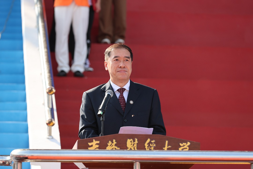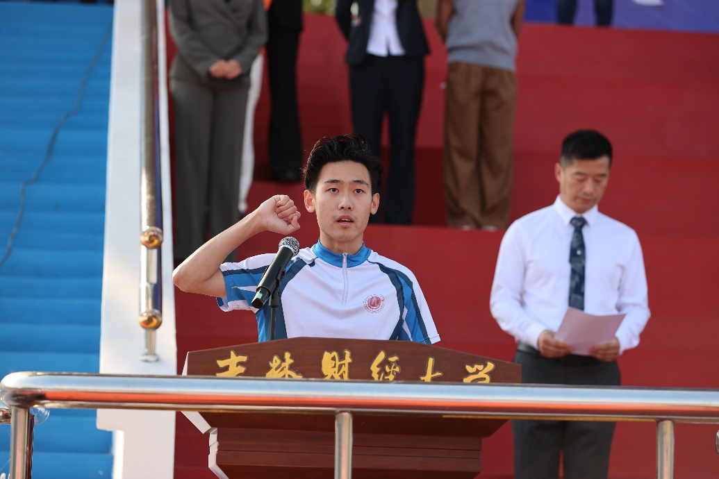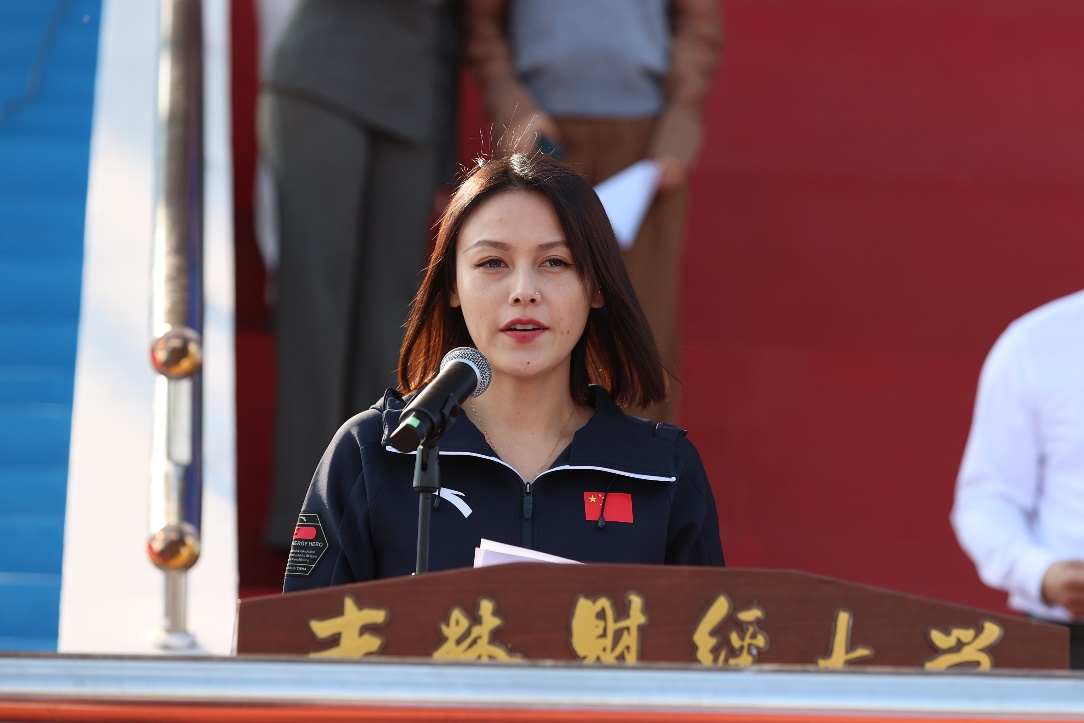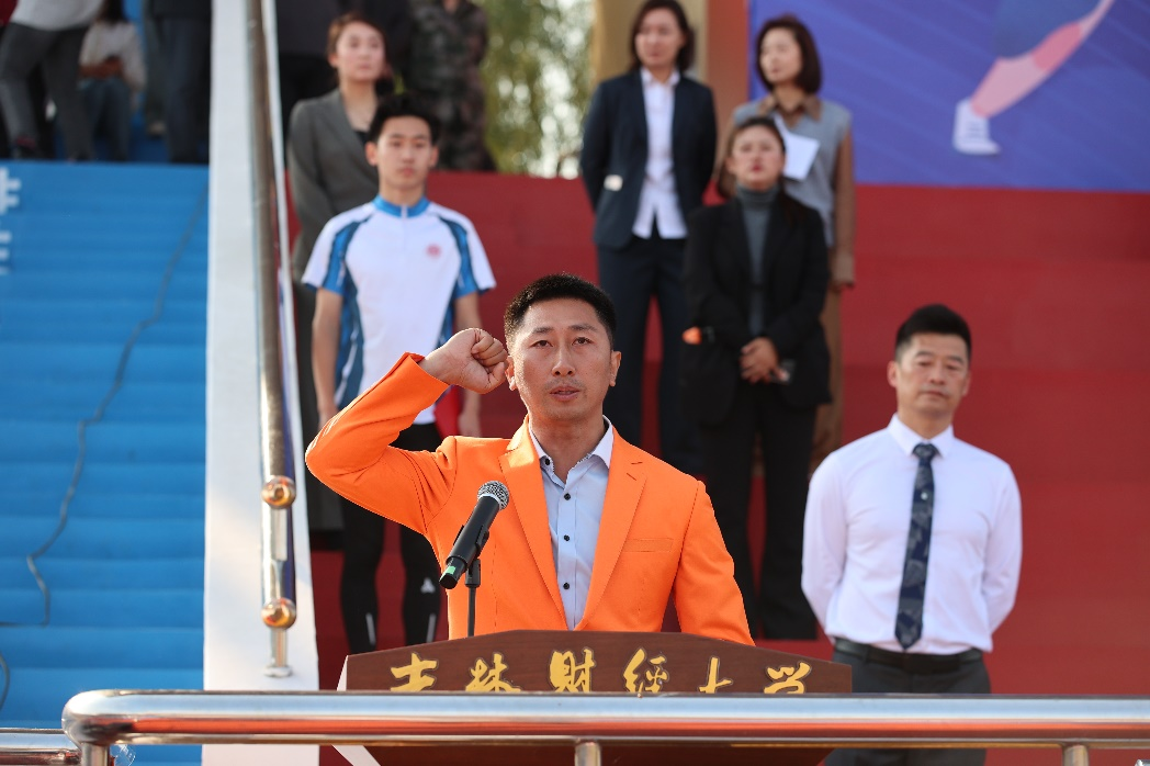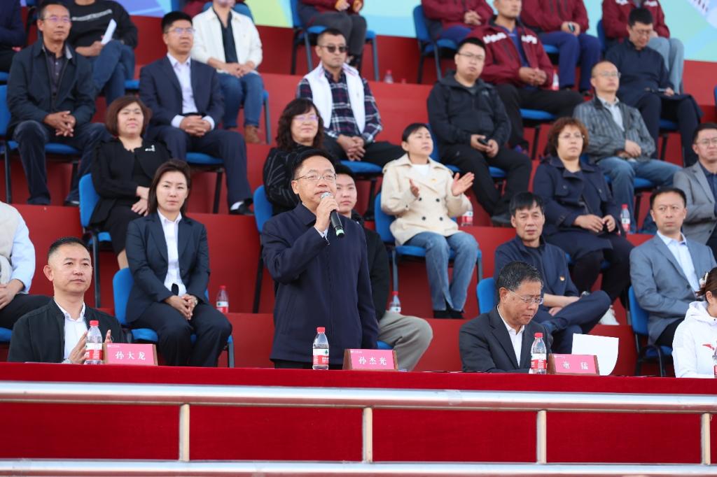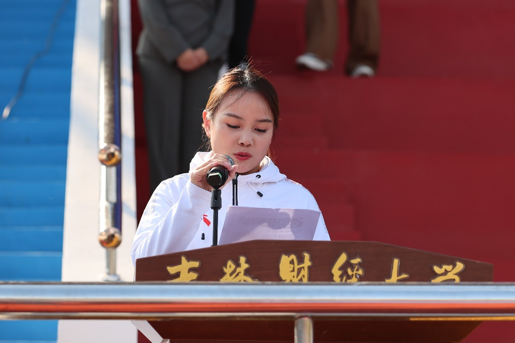 随后,党委副书记岳宏在致辞中指出, 体育承载着国家强盛、民族振兴的梦想;体育强则中国强,国运兴则体育兴。学校一直重视体育工作,纵深推进“四个融入、五育并举”,制定并实施“关于全面加强和改进新时代学校体育工作实施方案”,大力推广“一校多品”校园特色运动项目,体育教学、文体活动、全民健身呈现出勃勃生机。岳宏列举了吉财五年来在体育方面取得的诸多成就,充分展现了吉财青年的勇往直前的风貌和坚韧顽强的品质,以实际行动助力健康中国、体育强国建设,以团结拼搏书写新时代“吉财精神”。他希望同学们能够以饱满的热情、昂扬的斗志参与到各项活动当中,养成终身体育锻炼的习惯,成长为具有强健体魄、健全人格、社会责任、家国情怀的新时代大学生;希望老师们以更加饱满的姿态和健康的体魄,投身到教育教学的各项工作中,为祖国教育事业不懈奋斗。将体育运动与中国精神相结合,融入吉财文化,以实际行动弘扬光荣传统、赛续红色血脉,以优异的成绩为学校高质量发展献礼,为体育强国建设贡献青春力量。
