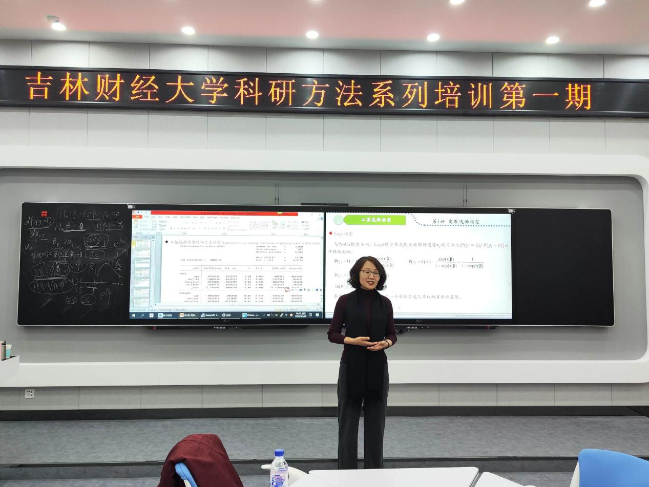 随后,张小宇开启本期培训第一讲。本讲主要针对二值选择模型的基本原理及软件操作进行讲解。张小宇介绍了Probit模型和Logit模型的基本形式、与普通回归模型的区别及适用场景,并使用stata软件现场教学,演示不同模型在统计软件中的具体操作,并对操作结果进行了详细解读。通过培训,很多老师表示对二值选择模型的原理及应用有了深入的了解,增强了应用该方法开展研究的能力。
