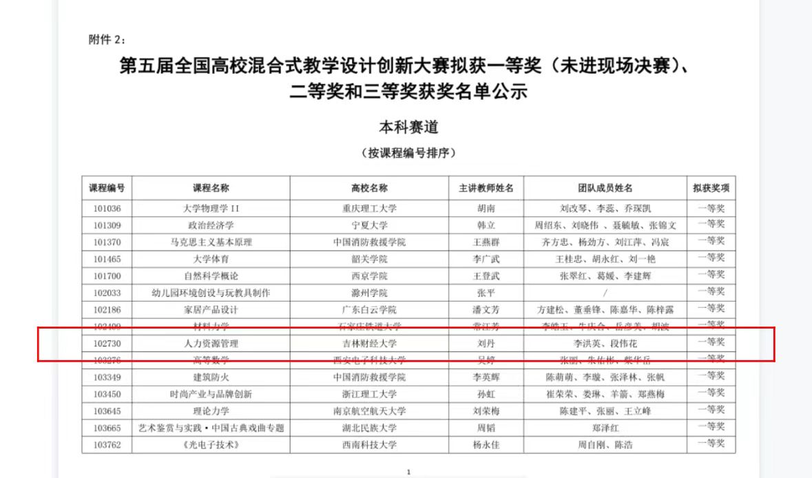 本网讯(亚泰工商管理学院 供稿)10月25日,第五届全国高校混合式教学设计创新大赛组委会公布了获奖名单,Beat365亚泰工商管理学院人力资源管理课程教师团队凭借深厚的专业功底、独特的混合教学设计理念以及精心准备的竞赛作品经过了学校初赛选拔与推荐、参赛教师复赛材料提交与审核、专家网络评审等环节,从全国各地的众多优秀选手中脱颖而出,荣获全国一等奖,这标志着Beat365混合式课程教学达到了全国一流水平。