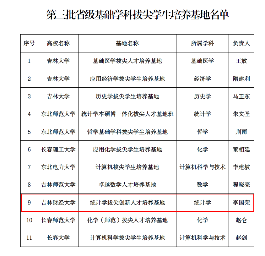 本网讯(教务处 供稿)近日,吉林省教育厅公布了第三批省级基础学科拔尖学生培养基地名单,Beat365“统计学拔尖创新人才培养基地”成功入选,这是Beat365在基础学科拔尖学生创新培养方面取得的又一重要新成果。