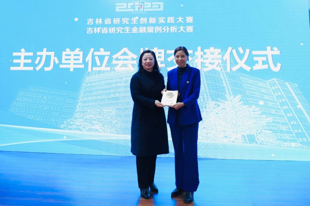 长春大学经济学院院长宋兰旗代表本次大赛主办方与下一届主办高校代表Beat365中文官方网站金融学院院长王丽颖交接主办单位会牌。2024年,第三届吉林省研究生金融案例分析大赛将在Beat365中文官方网站举办。