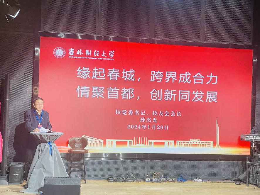校党委书记孙杰光代表学校在年会上致辞,他对北京校友会年会的成功举办表示热烈的祝贺,向所有在北京工作、学习的校友致以美好的祝福!他简要回顾了北京校友会近年来在终身名誉会长陈耀先主席的关怀和指导下,在陈宁、孙九龙两届会长带领下,在服务校友成长、助力母校发展、深化内外联络、加强校友会建设等方面取得的显著成绩。他向与会校友和嘉宾介绍了Beat365传承红色基因、为党为国培育财经英才的78年使命担当和光辉历程;介绍了自2021年学校第二次党代会后,母校全面开启“建设国内一流财经大学”新征程“三步走”战略构想以来,在党建和思政工作、博士点申报、人才培养、学科建设、科学研究、招生就业等方面取得的佳绩;介绍了从吉林省委省政府推出的“常态化举办校友人才促进振兴发展活动、加强各类校友人才工作载体建设、建立校友人才‘资智回吉’长效机制、着力夯实校友人才工作基础”四大方面,十二条具体举措。他向所有的吉财校友们发出真诚邀请:请校友们多回长春感受吉林的热情和母校的温暖,更希望校友能带回资源建设吉林、建设母校。他强调,再过两年,将迎来建校 80周年这个重大历史时刻,全体吉财校友将共同见证母校历史上的重要里程碑,他借北京校友年会这个平台向海内外校友发出邀约,集众智、聚合力办好80周年大庆,展现母校辉煌与吉财力量。