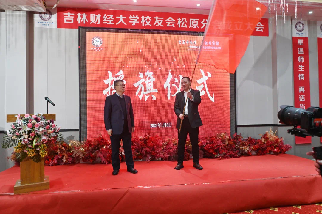校党委副书记刘鹤向新当选的松原校友会会长、85级校友李文祥授旗。
