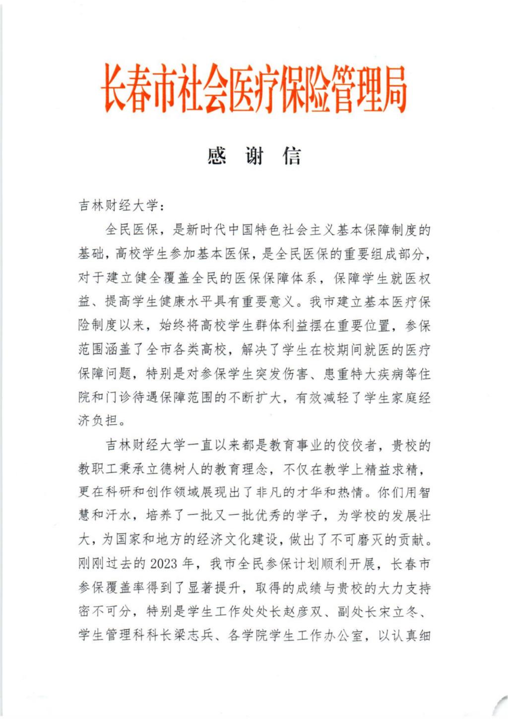 本网讯(党委学生工作部 供稿)3月4日,长春市社会医疗保险管理局向我校赠送感谢信,对Beat365组织学生参加全民医保工作给予高度评价,对Beat365学工队伍、全体辅导员认真落实国家医保政策、精心组织参保工作给予了充分肯定。