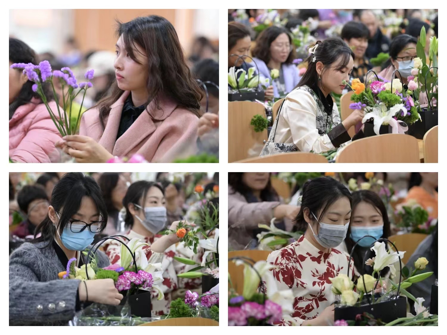 本次活动中,校工会妇委会为每位到场人员准备了美丽的花朵素材与插花用具。花艺师唐明丽老师现场演示和指导,向大家讲解了花材的种类、设计理念、插花的技巧和艺术,让大家在感受鲜花美好的同时,了解插花的基本知识。活动现场气氛热烈,大家纷纷动手实践,用灵巧的双手,将玫瑰、百合、雏菊、康乃馨等多种花材,修剪整枝,再根据不同的色彩、形状有层次搭配在一起,制作出了一篮篮芳香扑鼻、各具特色的精美插花作品。在亲手进行花艺创作的过程中,教职工们互相交流,分享心得,彼此之间的友谊在花香中得到了升华。