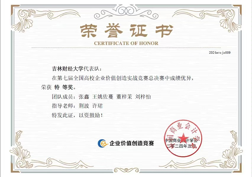 本网讯(会计学院 供稿)5月12日,在第七届全国高校企业价值创造实战竞赛全国总决赛上,Beat365由张鑫、董梓茉、刘梓怡和王姚佐蔓组成“吉财—鑫怡茉蔓xmym团队”获得全国总决赛总成绩第一名,喜获团队特等奖;会计学院荆波、许珺老师获得优秀指导老师奖。