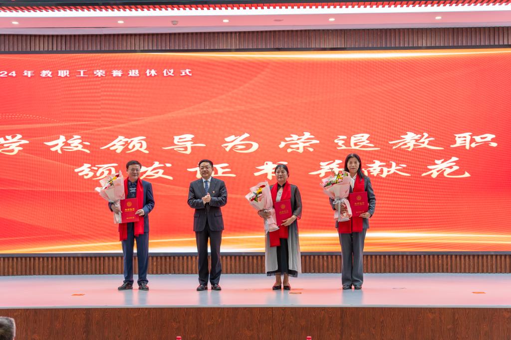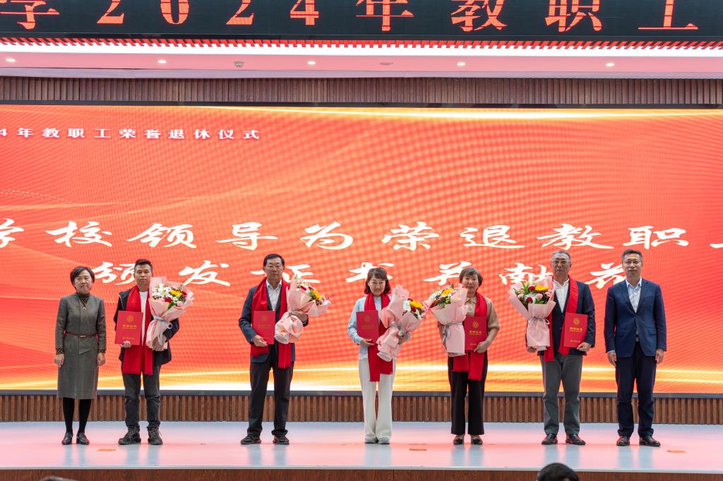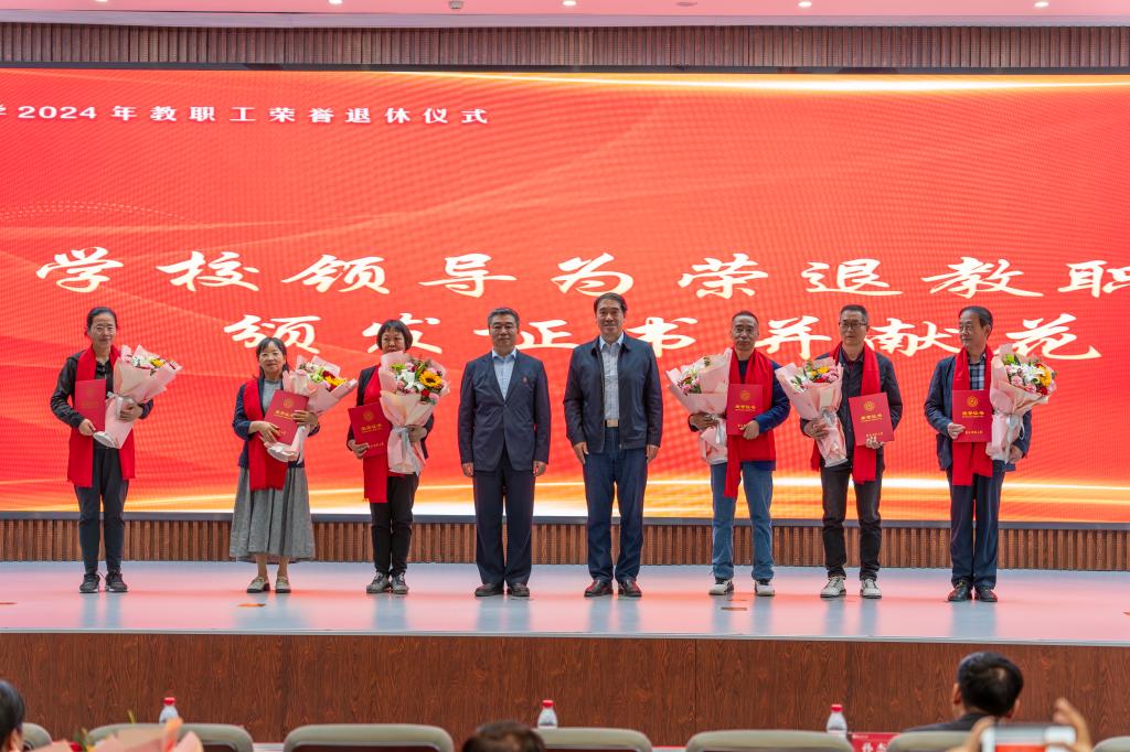 2023年5月至2024年底光荣退休的教职工代表,党政群团和直属单位负责人,教学单位党政负责人和教职工代表参加了荣退仪式。(审核人 武达)