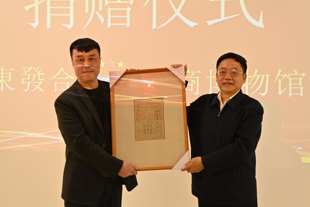 活动期间,孙杰光代表学校接受“东发合”传承人李铁顺董事长对学校的文物捐赠。
