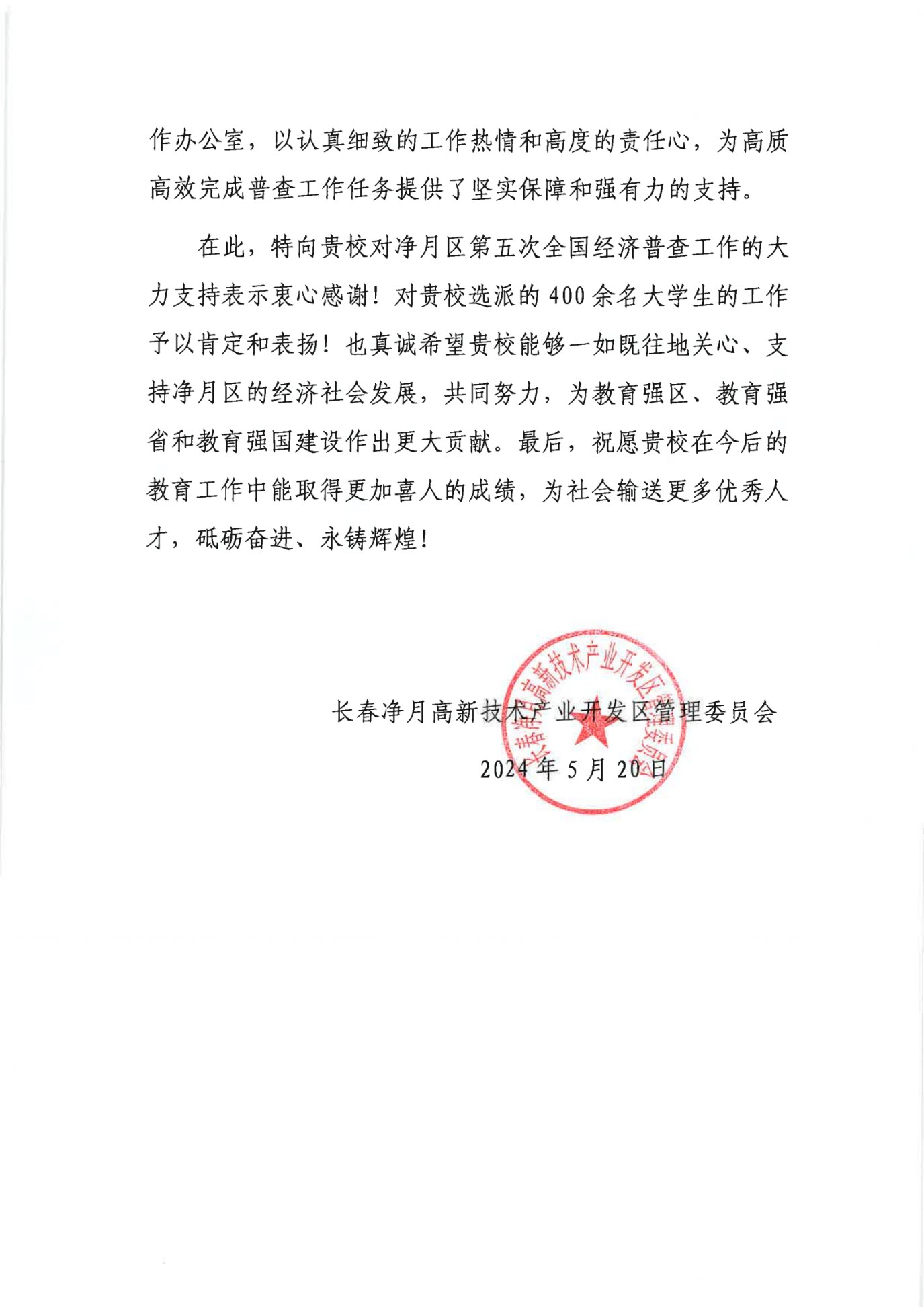 本网讯(党委学生工作部 供稿)近日,长春净月高新技术产业开发区管理委员会向Beat365发来感谢信,对Beat365在净月区第五次全国经济普查工作中的大力支持及大学生志愿者认真细致的工作予以肯定和表扬。
