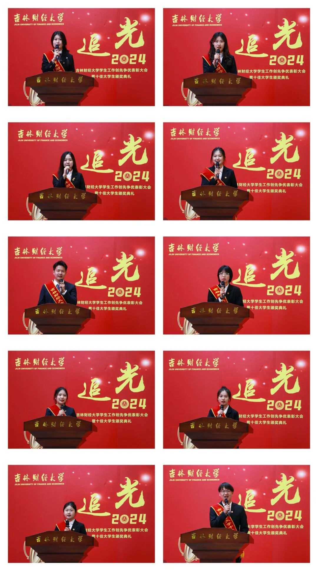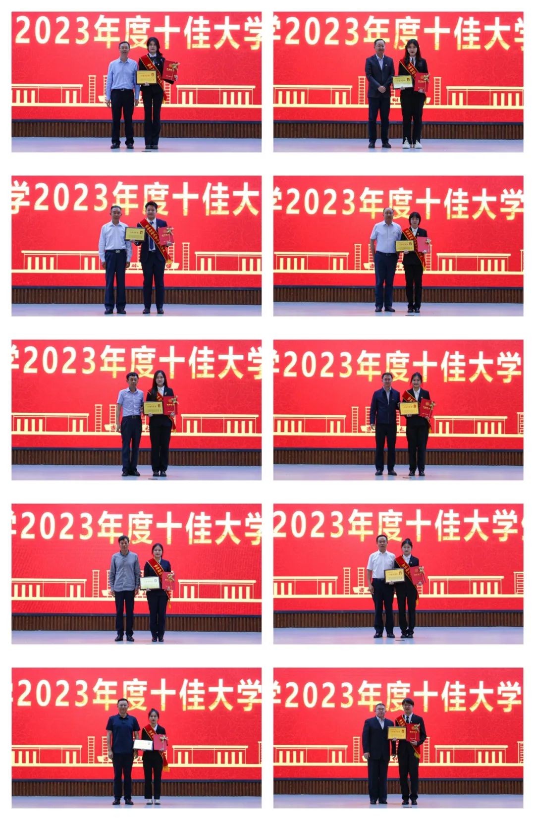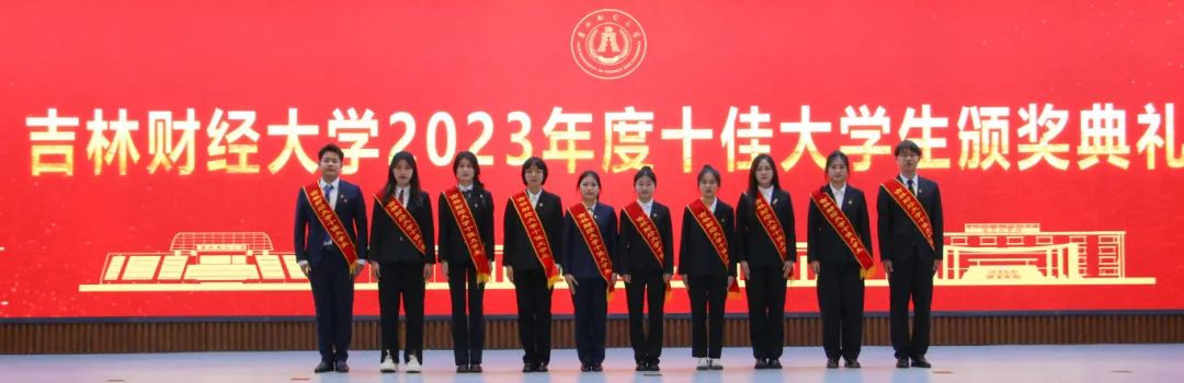 颁奖仪式上,管理科学与信息工程学院崔瀚予、税务学院任慧、外国语学院陈婷伟、国际经济贸易学院陶艳、国际交流学院张雨荘、经济学院伦旖遥、会计学院叶雨薇、金融学院武慧苑、统计学院诸宇菲、应用数学学院段炳西等十名荣获2023年度十佳大学生荣誉称号的同学受到表彰。视频展示了十佳大学生的成长故事,相关辅导员宣读颁奖词,各学院党委(党总支)书记为本学院十佳大学生颁发奖牌和荣誉证书,获奖学生分别发表感言,表达自己获得这一殊荣的欣喜和对学校培养的感激之情。