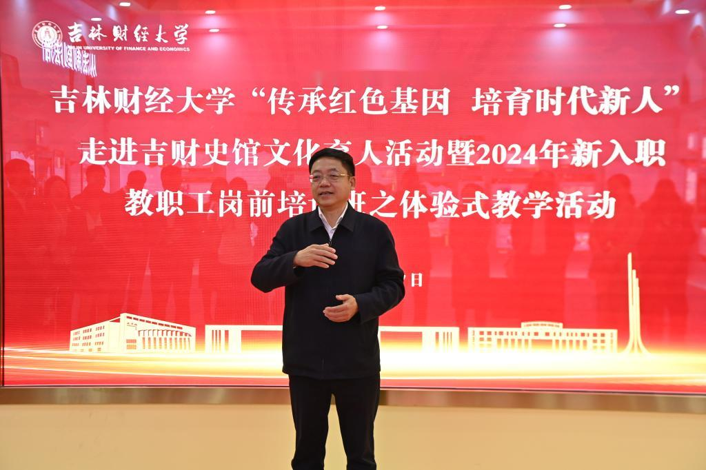 开班仪式上,校党委书记孙杰光带领新入职教职工开展了以“传承红色基因 培育时代新人”走进吉财史馆文化育人的体验式教学活动,通过“行走的思政课”“流动的思政课”形式为新入职教职工上了一堂生动的“入职第一课”,也是“四史”教育和中华民族发展史教育的思政课。课程依次在学校红色金融教育博物馆、百年财税思想史博物馆、吉商博物馆、资本论文献馆、营商环境数字博物馆和校史馆中进行。孙杰光对每个场馆办馆宗旨、展陈特色和育人功能做了全面阐述,对师生的讲解做了精准点评,并深情讲述了学校波澜壮阔的红色历史,引导广大青年教师深入了解党情国情省情和校史校情,坚守为党育人、为国育才光荣使命,尽快融入吉财、奉献吉财,以立德树人为根本,培养更多让党放心、爱国奉献、担当民族复兴重任的时代新人,为建设国内一流财经大学和服务吉林全面振兴新突破贡献智慧和力量。