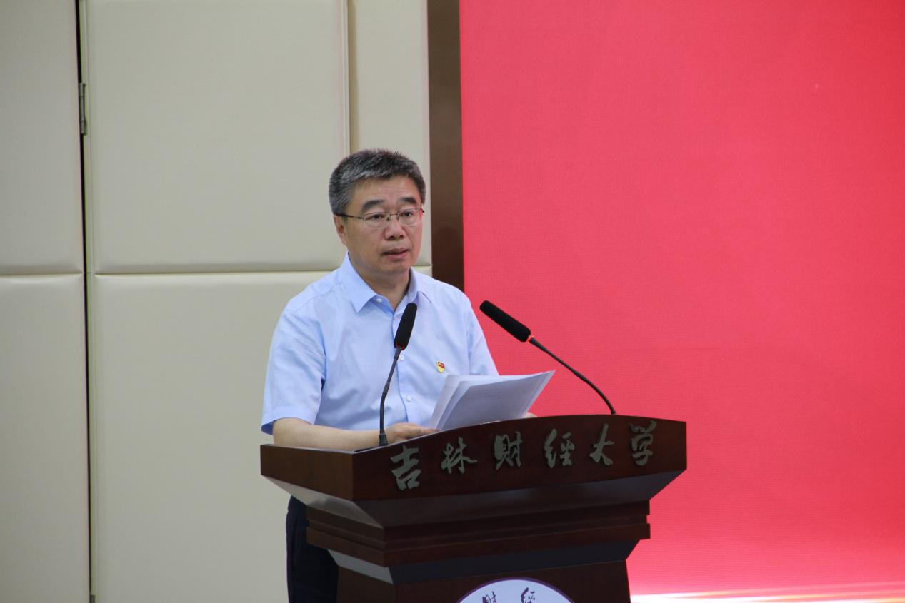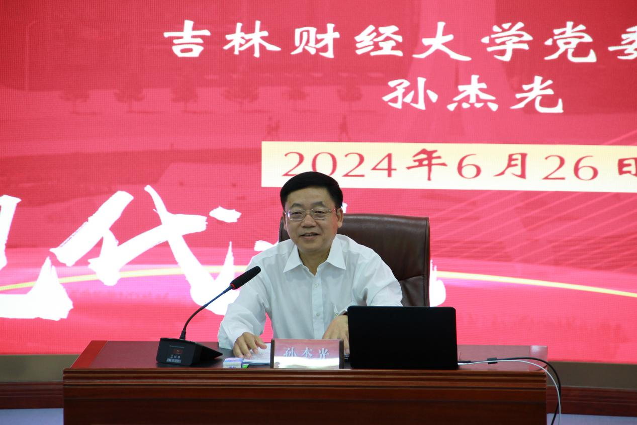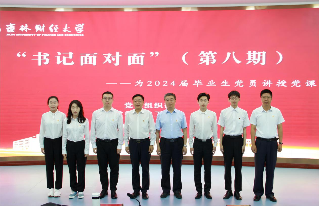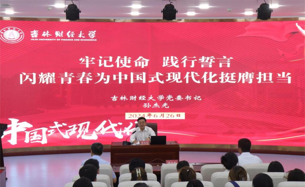 接着,校党委书记孙杰光以《牢记使命、践行誓言,闪耀青春为中国式现代化挺膺担当》为题,围绕“请党放心、强国有我,从习近平新时代中国特色社会主义思想中汲取奋发进取的智慧和力量”;“请党放心、振兴有我,在实现新时代吉林全面振兴率先实现新突破的新征程中贡献青春力量”;“请党放心、奋斗有我,在建设国内一流财经大学的新征程中汇聚吉财力量”三个方面,全面阐释了新时代吉财青年在中国式现代化进程中挺膺担当、在吉林全面振兴的伟业中踔厉奋发、在建设国内一流财经大学的征程中擘画蓝图的历史使命。他通过理论溯源、历史回顾和经验总结,向毕业生党员们全面系统地讲授了中国共产党为什么“能”,中国特色社会主义为什么“好”,归根到底是马克思主义“行”, 当代中国马克思主义、21世纪马克思主义行。他强调,青年党员务必深刻把握学习贯彻习近平新时代中国特色社会主义思想的根本要求,坚定拥护“两个确立”、坚决做到“两个维护”;务必牢牢把握将党的创新理论自觉运用到贯彻落实党的二十大重大战略部署中;务必不断深化对习近平经济思想的系统学习。对完整、准确、全面贯彻新发展理念,高质量发展首要任务,构建新发展格局战略任务,加快培育新质生产力和科技自立自强等都要有深入系统的学习。他指出,位于新起点的东北,振兴大潮激荡;迈向新征程的吉林,发展势头强劲。他围绕四个“读懂”,即“读懂吉林全面振兴新气象,在把握潮流中追逐梦想、拥抱未来”“读懂吉林发展布局新机遇,在时代舞台中人生出彩、彰显价值”“读懂吉林人气高涨新热度,在汇聚力量中激扬梦想、共绘蓝图”“读懂吉林利好政策新优势,在创新创业中一展身手、成就未来”,号召广大青年党员努力学习、志在报国,勇当先锋、倾情奉献,宣传吉林、推介吉林,以时不我待的紧迫感、只争朝夕的使命感、奋斗有我的责任感,做让党放心、爱国奉献、堪当民族复兴重任的时代新人。让青春与吉林来一场“双向奔赴”,在吉林振兴发展的生动实践中实现梦想、成就自我,共同书写吉林全面振兴新突破的精彩华章。