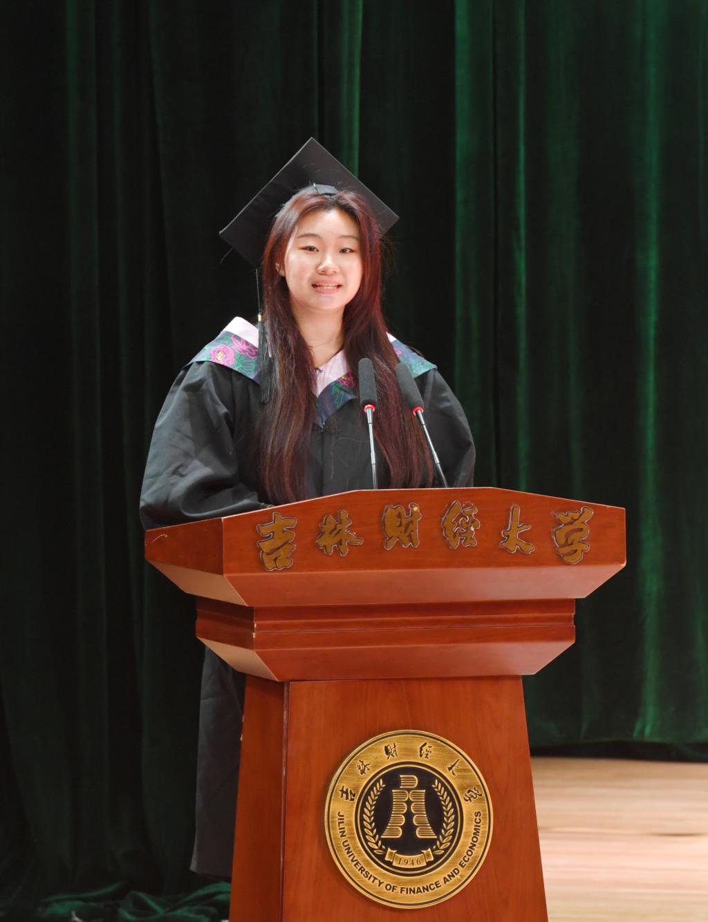 国际交流学院金融学专业王丹彤同学代表2024届本科毕业生发言,对陪伴我们一路走来的母校、老师、同学表达了最真挚的谢意。