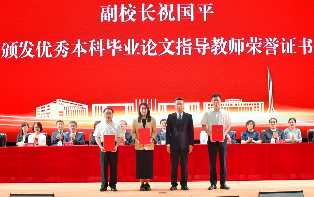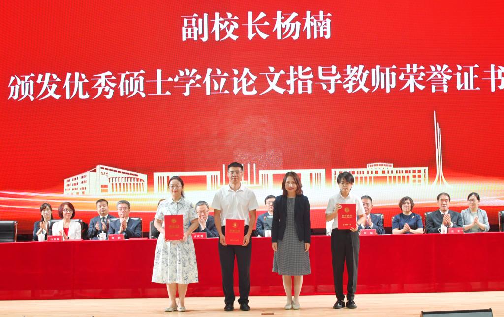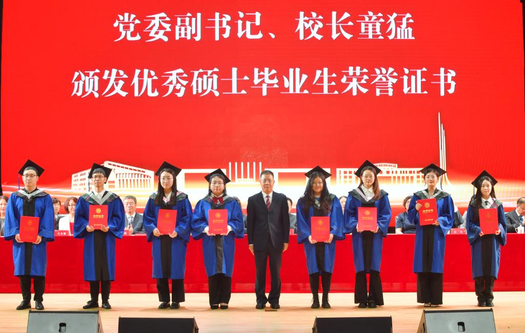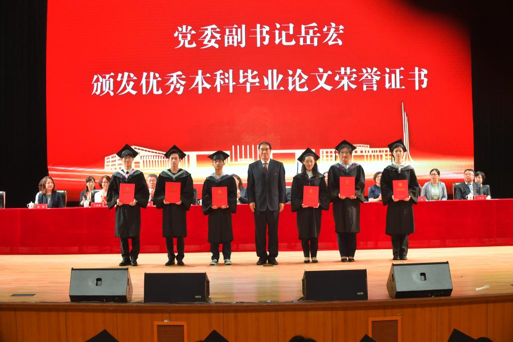 仪式上,党委书记孙杰光,党委副书记、校长童猛,党委副书记岳宏,纪委书记、监察专员丁庆东,副校长祝国平和杨楠,分别为优秀本科毕业生代表、优秀硕士毕业生代表、优秀本科毕业论文作者代表、优秀硕士学位论文作者代表和优秀本科毕业论文指导教师代表、优秀硕士学位论文指导教师代表颁发了荣誉证书。