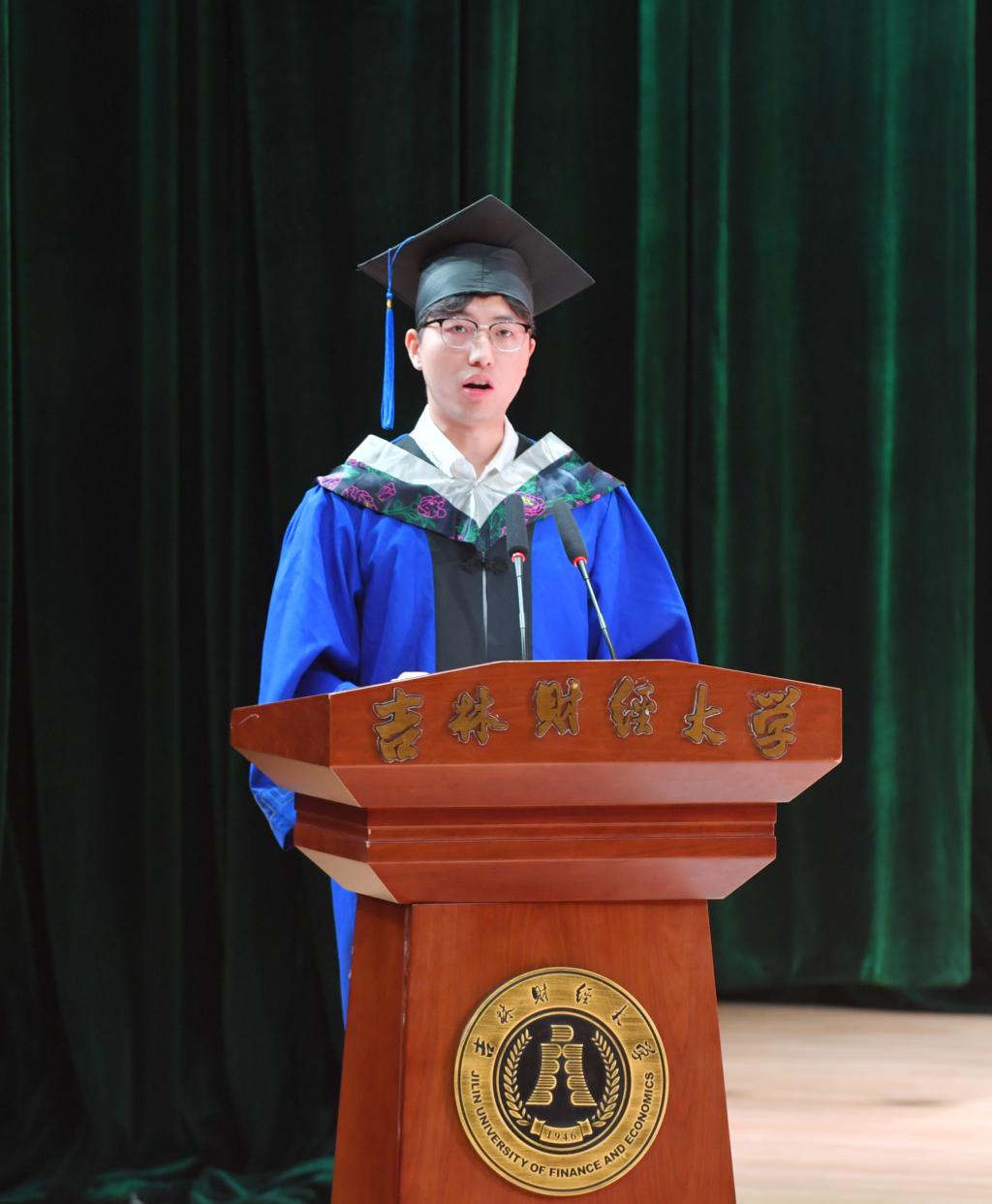 经济学院政治经济学专业李西鹏同学代表2024届硕士研究生发言,表达了对母校悉心培养的感谢与祝福之情,并对母校、老师和同学们送上了美好的祝福。