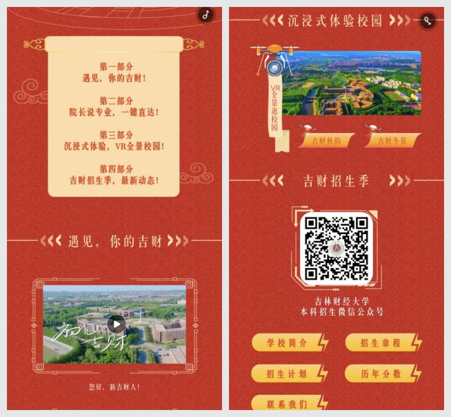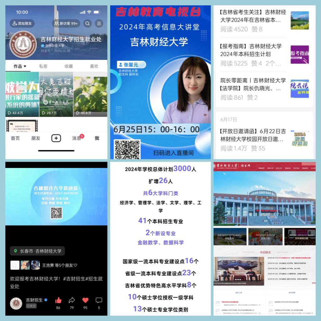 构建多元化宣传咨询模式。学校积极推进“吉财招生”公众号、Beat365中文官方网站本科招生网、抖音官方账号、微信视频号、朋友圈、今日头条等招生宣传新媒体矩阵建设。2024年上半年,在微信公众号、今日头条等平台发布各类招生相关讯息百余条、各类短视频累计浏览量超过了140万人次。开展了“吉财院长说专业”系列直播、吉林教育电视台招生政策解读专场直播,推出“Beat365中文官方网站线上展”“吉财专业巡礼”“十佳学子说专业”“考生关注!吉财报考指南”等招生宣传系列栏目,全方位解读最新招生政策、学科专业优势、人才培养特色、教育教学改革、科研学术成就、校园文化活动。在《2024年本科生招生简章》中新增“校友”“就业”专栏,真实呈现吉财的校友发展和毕业生就业情况,全面展示学校办学成果和社会影响力。举办2024年校园开放日活动邀请考生和家长沉浸式体验学校校园文化;开展“筑梦吉财”第四届“吉财学子高中母校行”活动,近300名吉财学子回到母校高中,传播吉财声音,进一步提升了学校的知名度和影响力。为方便考生和家长咨询,学校积极畅通教育部阳光高考网答疑通道,线上回答考生问题近300条。学校本科招生办公室开通了10部咨询热线电话,在报考期间每天工作时长达12个小时,为考生和家长答疑释惑。
