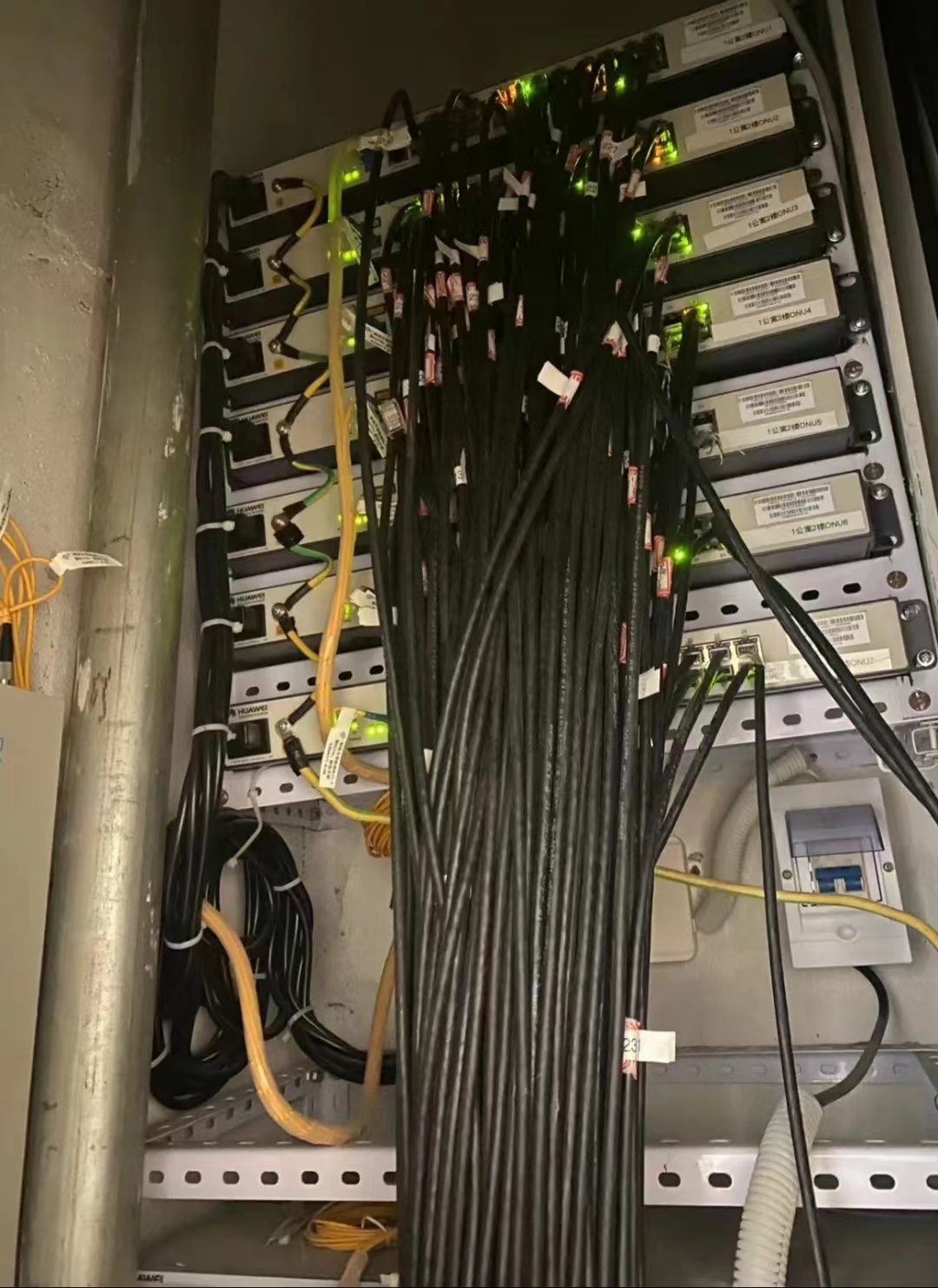现在,宿舍楼里的宽带线路和设备都焕然一新啦!信息管理中心组织移动、联通、电信三大运营商对公寓弱电井内的宽带线路、设备进行整改,把线路整理得井井有条,设备清理干净、更新换代,同时撤下了那些散热功率大、已停用的设备。