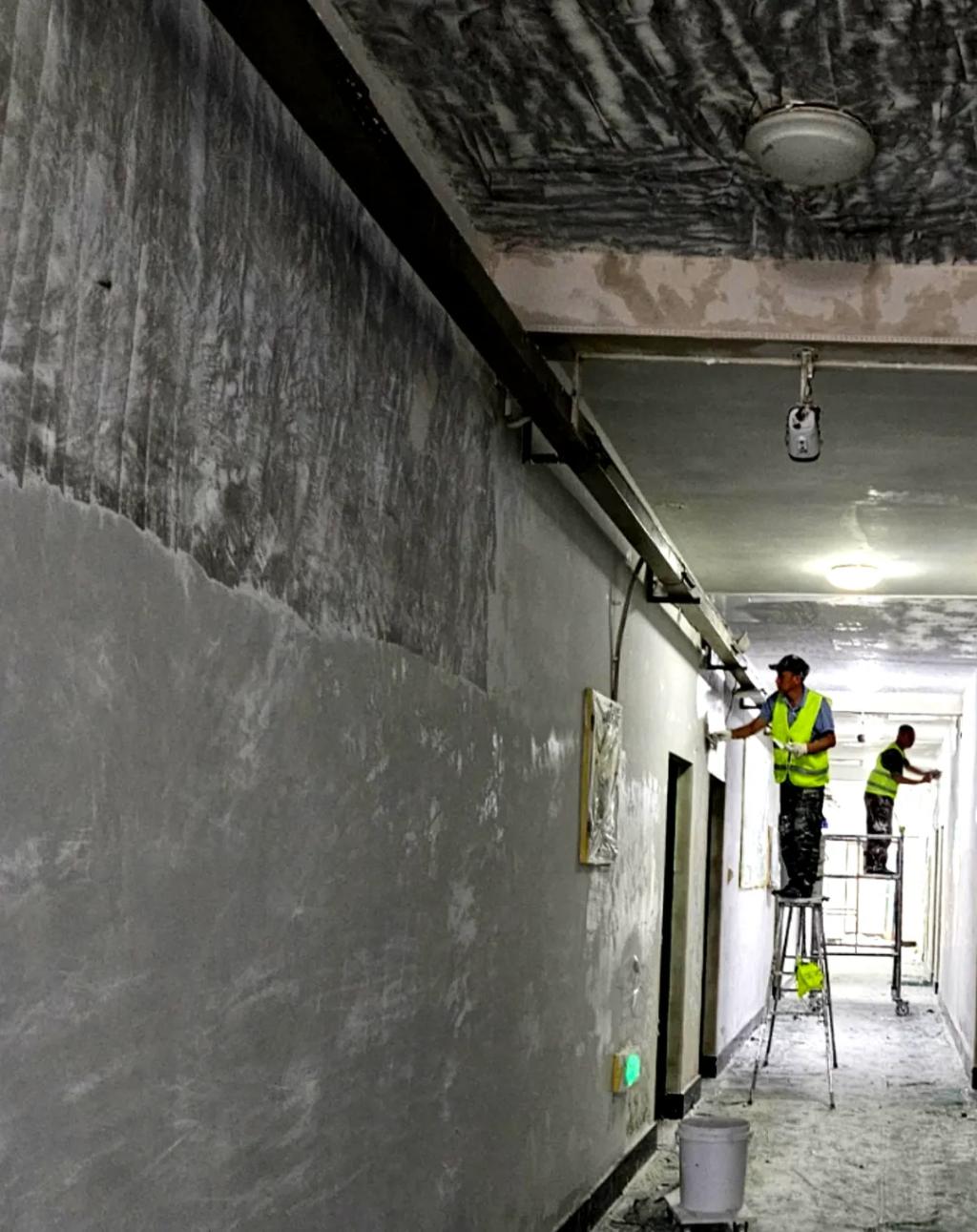对墙壁起鼓脱落大白清除,然后进行大白粉刷、砂纸打磨、乳胶漆喷刷。