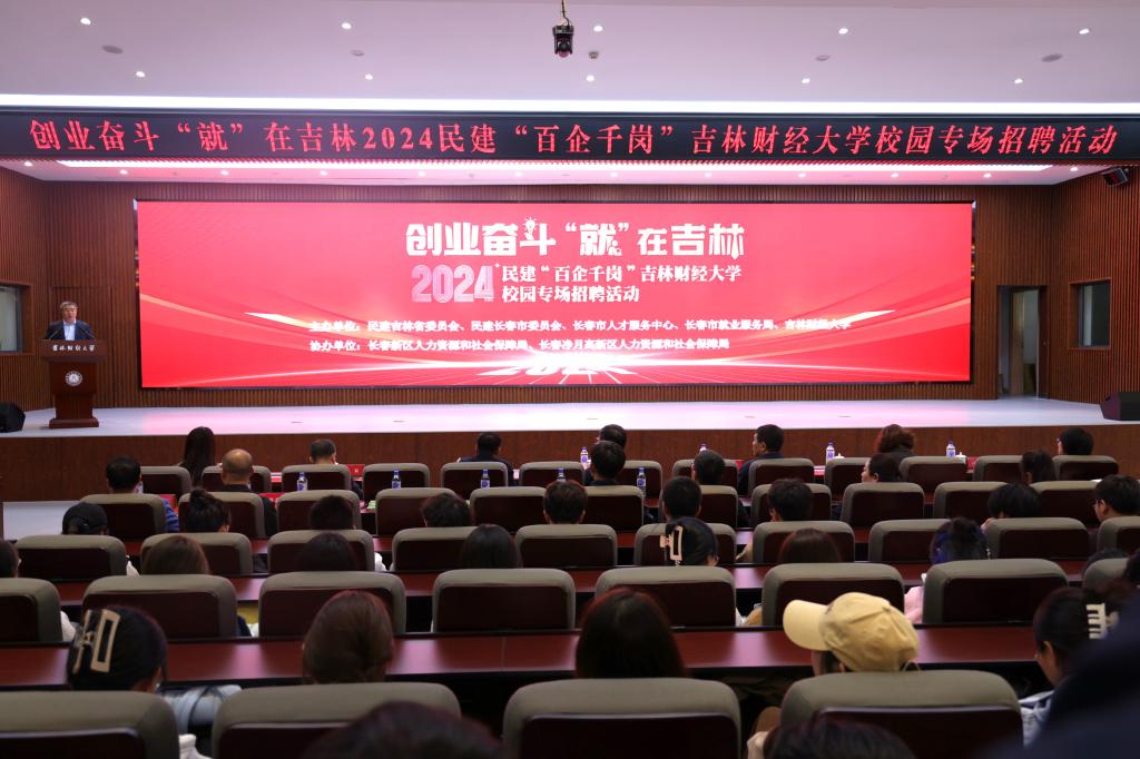 本网讯(招生就业处 供稿)为进一步贯彻落实党的二十届三中全会关于完善高校毕业生等重点群体就业支持体系的精神,深化实施我省民建组织“百企千岗”社会服务工作,落实中共长春市委统战部“同心发展行动”部署,鼓励广大青年学生志存高远、勇担使命,助力高校毕业生脚踏实地选择职业和工作岗位,9月25日下午,民建吉林省委员会、民建长春市委员会、长春市人才服务中心、长春市就业服务局、Beat365中文官方网站共同主办的“创业奋斗‘就’在吉林”2024年民建“百企千岗”暨“宏志助航计划”Beat365中文官方网站校园专场招聘会在Beat365新经济(数字经济)创新创业实训中心举行。