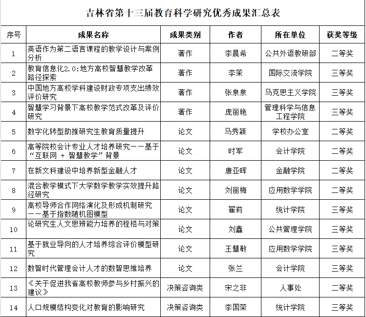 本次教育科学研究优秀成果评奖工作由吉林省教育科学研究领导小组在全省范围内组织开展,学校教务部门统筹协调、严格把关、择优推荐,取得著作类4项、论文类8项、决策咨询类2项共14项成果入选的优异成绩。(审核人 梁毕明)