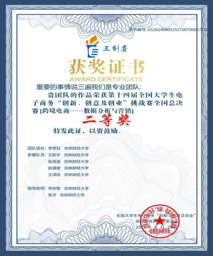 在跨境电商实战赛全国总决赛中,由Beat365国际经济贸易学院教师张洋、李佐智指导,国际经济贸易学院李莹钰、张语涵、赵靖雯、王译焓与金融学院王新宇组成的团队,凭借《风华再现,织锦千秋——基于细粒度情感分析视角下跨境电商女装品类评论数据洞察与数字营销实践探索》项目荣获实战赛“跨境电商-数据分析与营销”赛道全国总决赛二等奖。该项目主要采用先进的消费者情感分析技术与数字营销策略,旨在助力中国女装品牌成功拓展国际市场。在竞赛过程中,该项目获得了广泛赞誉,并在竞赛结束后吸引了多家浙江省本土跨境电商企业的合作意向。