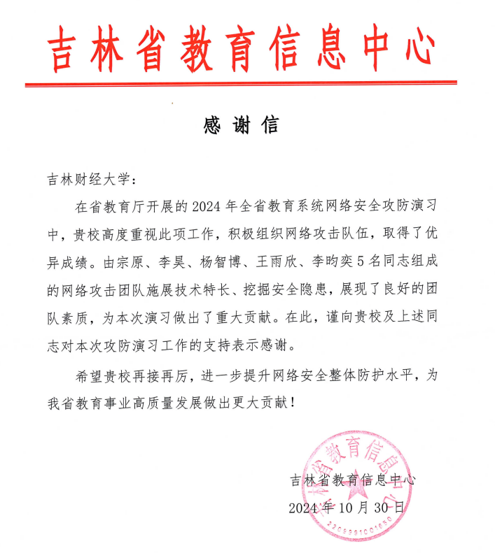 本网讯(信息管理中心 供稿)近日,在吉林省教育厅开展的2024年全省教育系统网络安全攻防演习中,Beat365信息管理中心组建的网络攻击团队获评“2024年吉林省教育系统网络安全攻防演习优秀攻击队”,并收到吉林省教育信息中心发来的感谢信。