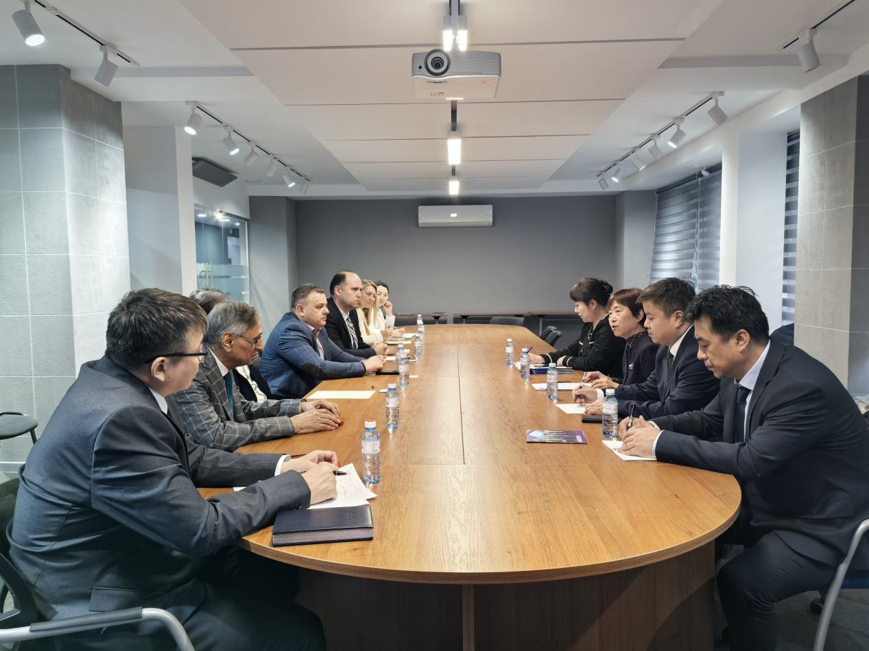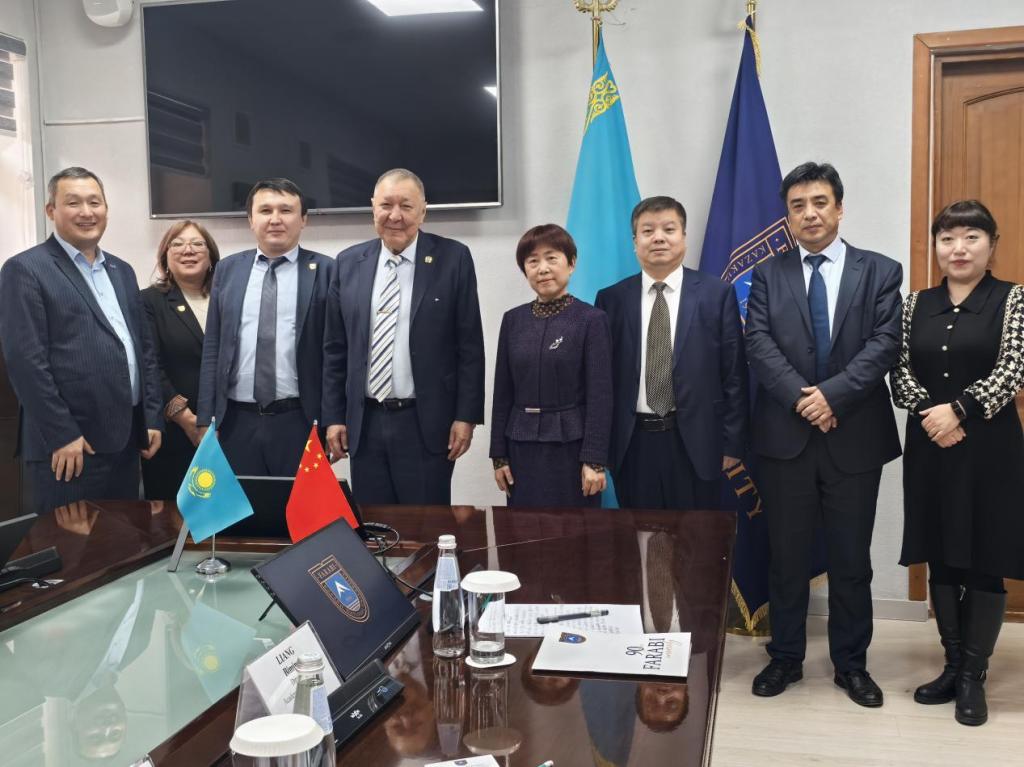 11月29日,代表团访问哈萨克斯坦阿里·法拉比哈萨克国立大学。通过参观该校校史馆,代表团深入了解了该校深厚的历史底蕴与学术成就。该校最新QS世界高校排名位列第163位,已与北京大学、上海外国语大学、武汉大学等43所中国高校建立合作关系。代表团与该校副校长耶金、科学创新系主任马尔古兰、国际合作部主任埃斯波尔、系教务主任巴克特开展了深入交流,双方积极探索实施硕博联合培养、教师互访等多种方式的交流渠道,并达成初步合作意向。