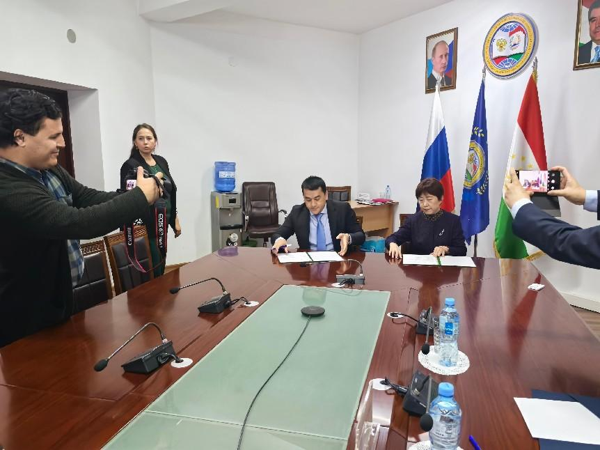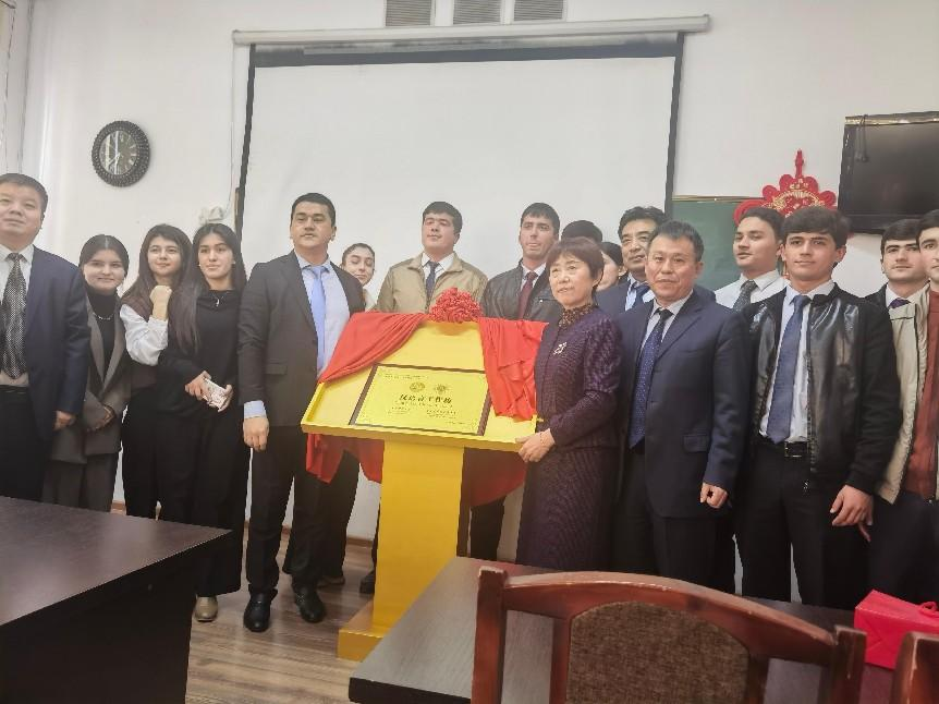 11月25日,代表团一行访问哈萨克斯坦俄罗斯-塔吉克(斯拉夫)大学,该校副校长拔赫托瓦尔、国际处处长撒里霍夫、东方语系主任霍得热姆洛托娃、外语系主任撒依托娃接待代表团。双方就学生交换和教师交流合作方式、本硕博多层次人才联合培养项目等方面进行了深入交流,并签署合作备忘录。王菁华代表学校向该校捐赠图书,与拔赫托瓦尔为两校共建的“汉语言工作坊”进行揭牌,能够有效推动该校学生学习汉语和了解中国文化。代表团随后参观了该校教学场所,并与学生进行了亲切交流。