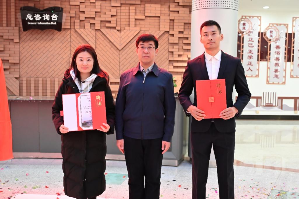 王菁华和孙之光分别为孙钦波、宋阳、张馨元、许鸿楠四位特聘指导教师颁发聘书。