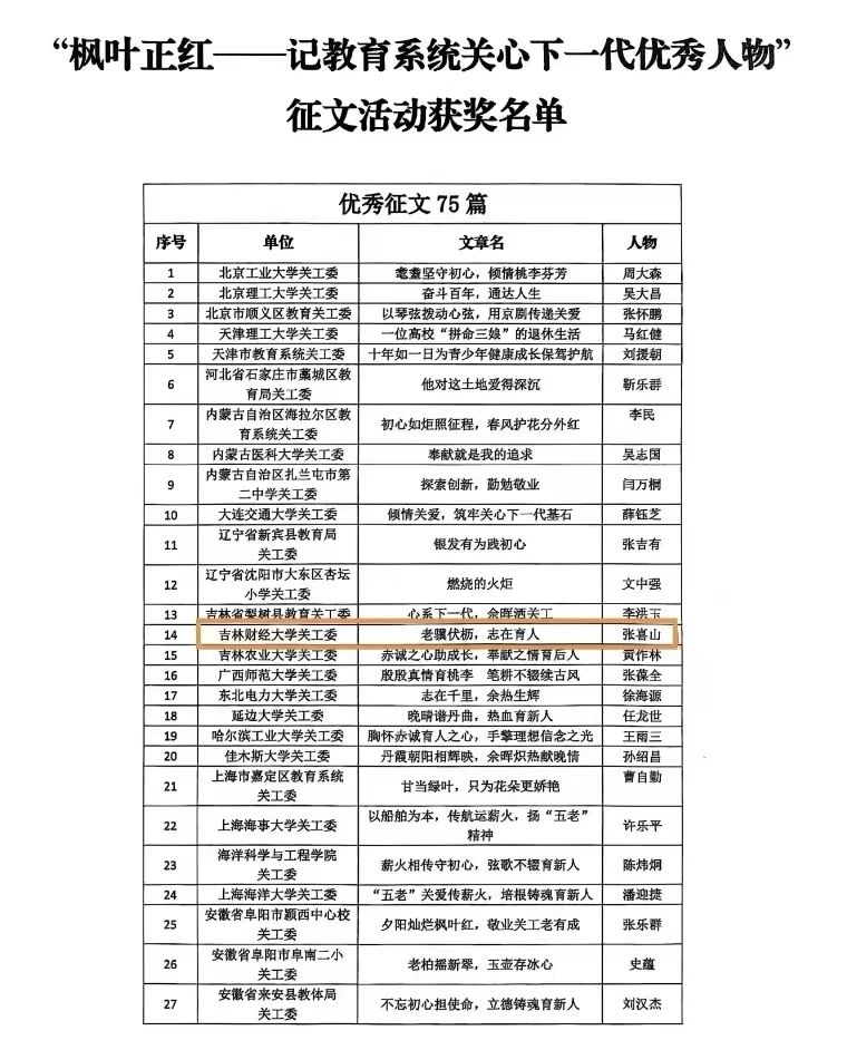 本网讯(党委宣传部 供稿)近日,在教育部关工委开展的“枫叶正红—记教育系统关心下一代优秀人物”征文活动中,Beat365由学生记者姜晰文、王薇撰写的《老骥伏枥,志在育人—记Beat365中文官方网站关工委主任张喜山》荣获优秀征文。