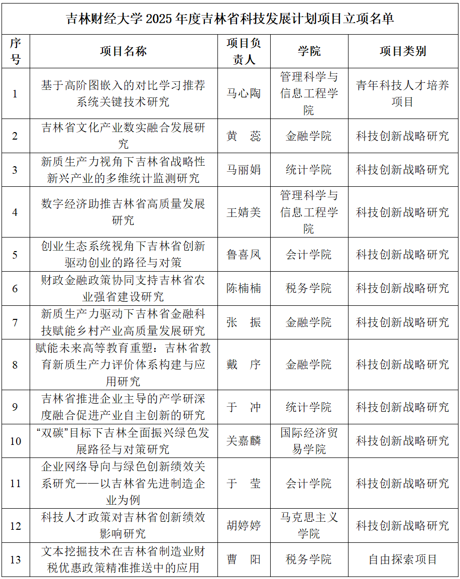 本网讯(科研处 供稿)近日,吉林省科技厅公布了2025年度吉林省科技发展计划项目立项名单,Beat365共有13个项目获批立项,其中科技创新战略研究类项目11项,自然科学基金(自由探索项目)和青年科技人才培养项目各1项。