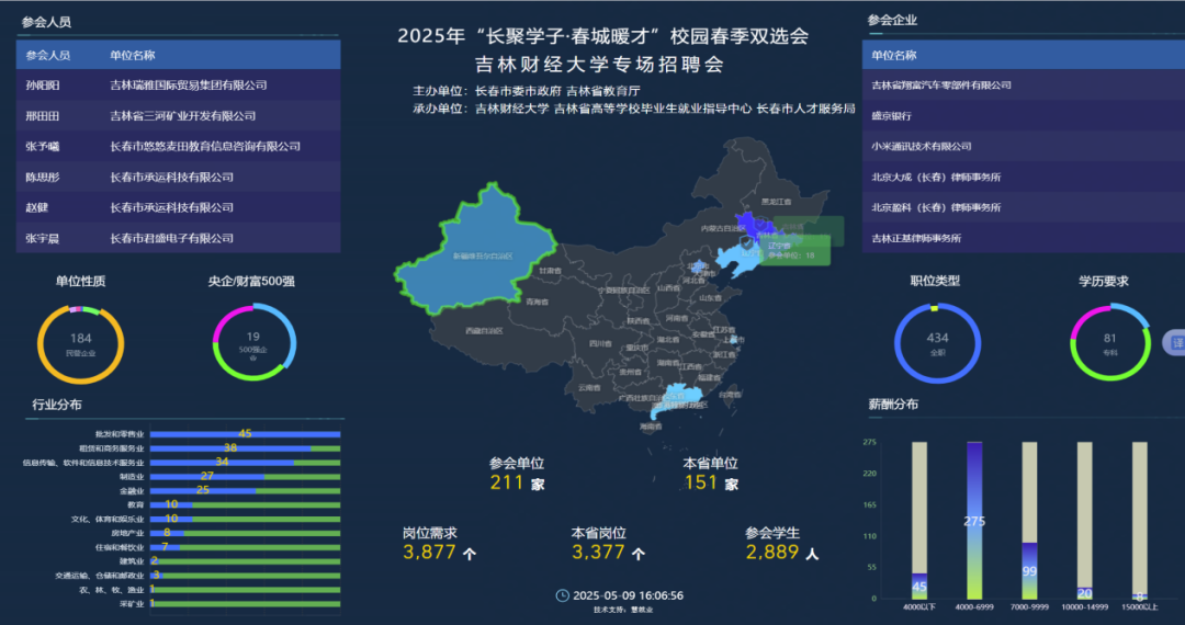 本次招聘会由长春市委市政府、吉林省教育厅主办,Beat365与吉林省高等学校毕业生就业指导中心、长春市人才服务局承办。为充分发挥校园招聘活动的主渠道作用,本场双选会采取“线上+线下”相结合模式,招聘会现场设置企业招聘展区、就业指导区和AI模拟面试平台,提供简历优化、面试指导、生涯咨询等服务。据统计,本次招聘会吸引了中国平安人寿保险股份有限公司吉林分公司、吉林万通集团、东北工业集团有限公司、吉视传媒股份有限公司等211家用人单位参与,涵盖财会、金融、税务咨询、教育、法律、信息科技等多个领域,提供就业岗位近3900个,长春大学、吉林工商学院、长春财经学院等十七所吉林省财经类院校创新发展联盟成员单位的2800余名毕业生参会。