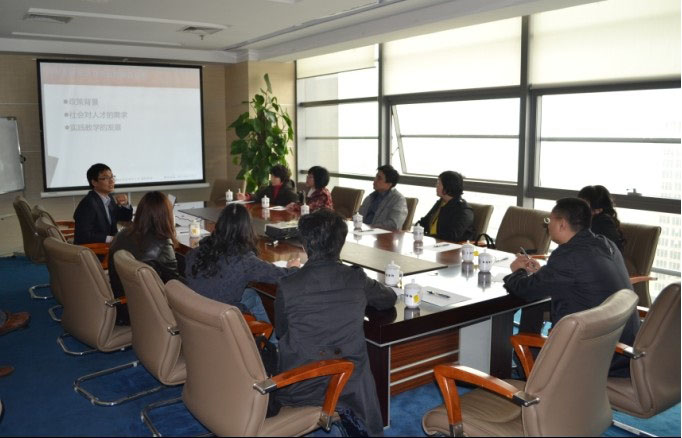 调研期间,杨春梅副校长带队参观了北京工商大学经济管理实验中心,并就实验教学建设思路、原则以及开展互动式、跨专业、跨学科的综合性实验教学活动等方面,与北京工商大学文科实践中心主任及项目组专家进行了交流。之后又分别听取了清华软件园北京方宇博业科技有限公司对“跨专业校内综合实习平台”研发背景、研发理念、平台特色等方面的讲解,和用友新道科技有限公司对“虚拟商业社会环境VBSE平台”的设计理念、功能介绍及校企合作模式的介绍。