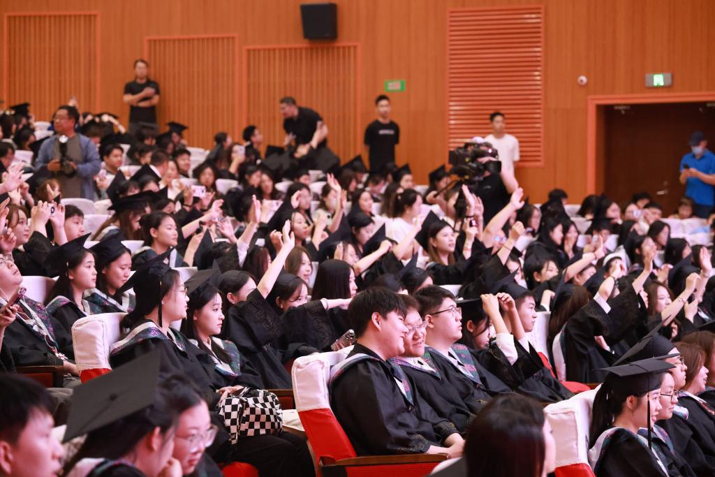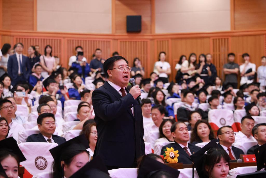 党委副书记、校长马秀颖在致辞中表示,同学们在求学时光中,与时代同频共振,见证诸多盛事与浪潮;与学校荣辱与共,助力学科、师资、科研等多方面发展进步;与同窗同楫奋进在学业与竞赛中,斩获众多荣誉,用青春书写了与时代、学校、彼此相伴成长的精彩篇章。临别之际,马秀颖结合“明德崇实”的校训和“尚学致用、择善鼎新”的学校精神寄语毕业生:一愿始终以“明德”为立身之本,以“崇实”为行事之基,做品德与实干兼具的践行者;二愿永葆“尚学”的求知热忱,践行“致用”的实践智慧,做终身学习与知行合一的奋进者;三愿坚守“择善”的正道原则,秉持“鼎新”的破局之力,做勇立潮头突破定式的革新者,以无畏的姿态,尽情领略人生旅途的万千风景。