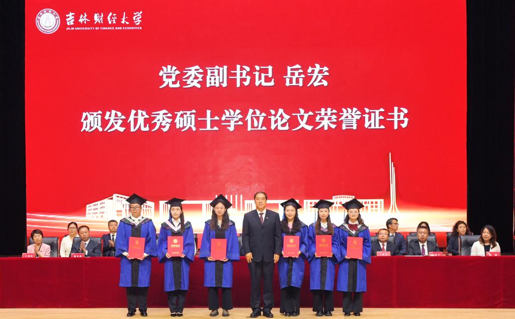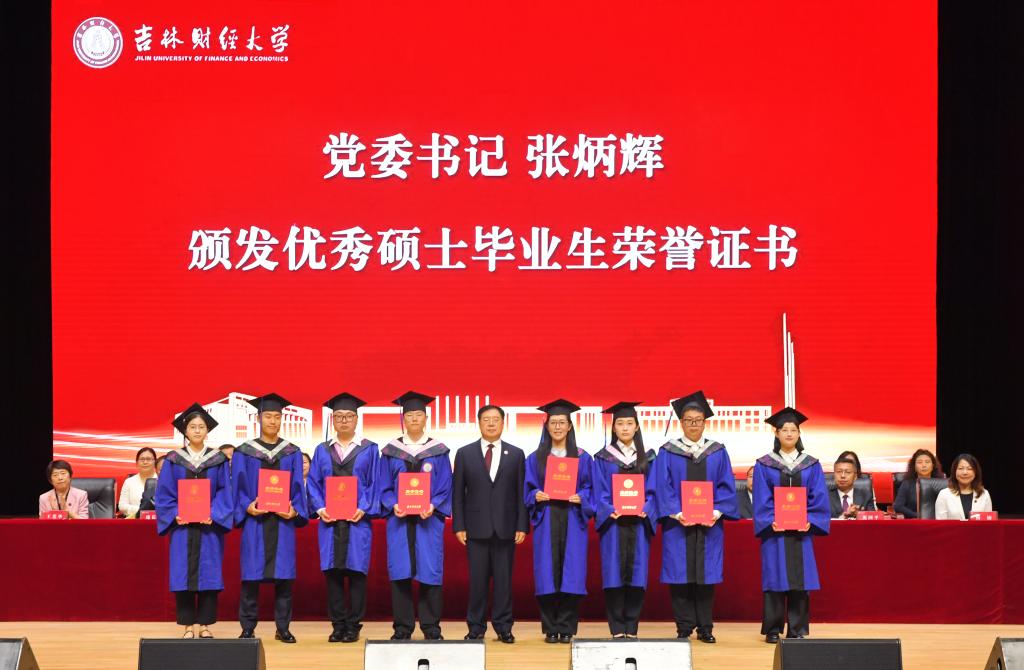 仪式上,党委书记张炳辉,党委副书记、校长马秀颖,党委副书记岳宏,纪委书记、监察专员丁庆东,副校长庞长亮和杨楠,分别为优秀本科毕业生代表、优秀硕士毕业生代表、优秀本科毕业论文作者代表、优秀硕士学位论文作者代表和优秀本科毕业论文指导教师代表、优秀硕士学位论文指导教师代表颁发荣誉证书。