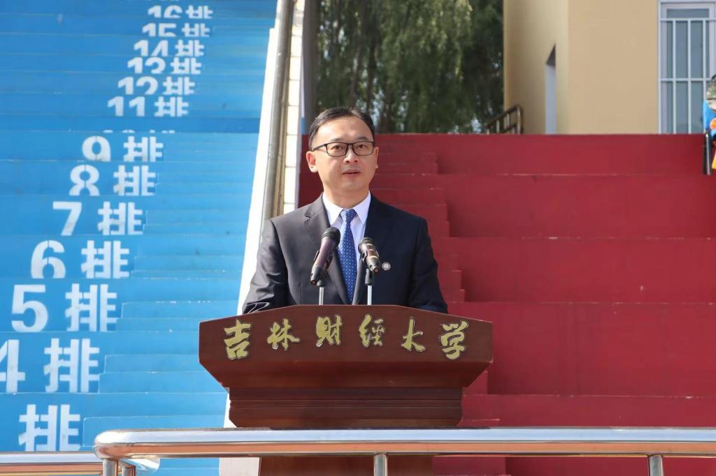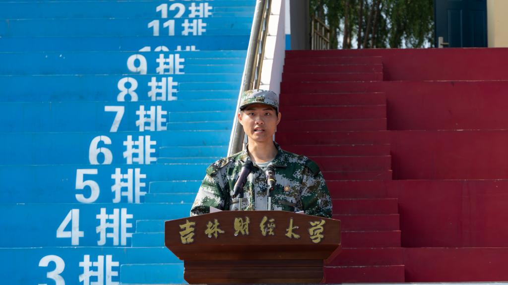 语言文化学院学生周广权代表2025级学生发言。他表示,军训历程中,同学们挥洒汗水、淬炼意志、收获成长。未来,全体同学必将传承集体主义与爱国主义精神,勇于攻坚克难、直面挑战,以军训中点燃的奋斗之火照亮前行之路,努力成长为有理想、有担当的吉财人,成为有作为、有梦想的新时代青年。