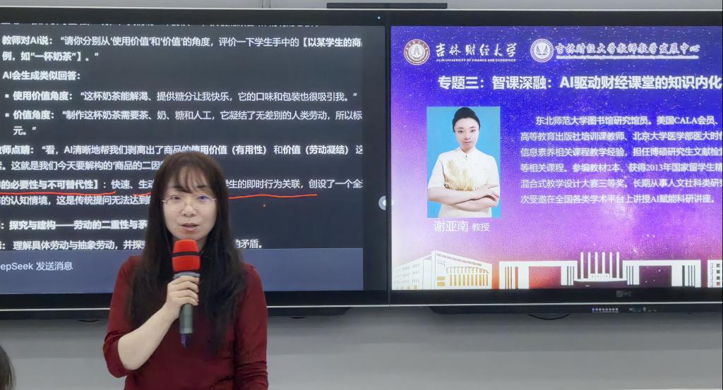 10月17日上午,东北师范大学图书馆研究馆员谢亚南以“智课深融:AI驱动财经课堂的知识内化与自主学习实践”为题,聚焦财经领域教学创新中的“AI生成教学支架”“智能互动场景搭建”“形成性评价体系”“批判性思维训练”等实施路径进行了讲授。她结合案例库AI标注系统等实操案例,强调财经教学需兼顾“技术赋能”与“风险意识培养”,建议教师善用AI工具挖掘思政元素,增强课程的时代性与思想性。