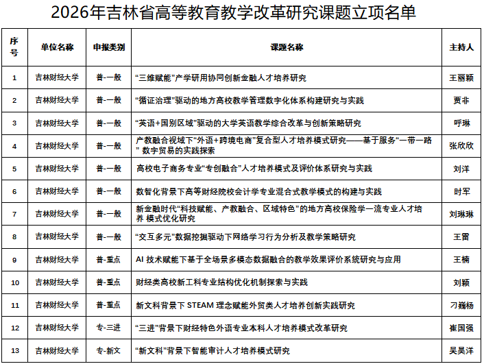 本网讯(教务处 供稿)近日,吉林省教育厅公布《2026年吉林省高等教育教学改革研究课题立项名单》。经专家评审,Beat365共有13项课题获批立项。本次立项包括重点项目3项,一般课题8项,专项课题2项,共获得经费资助7万元。