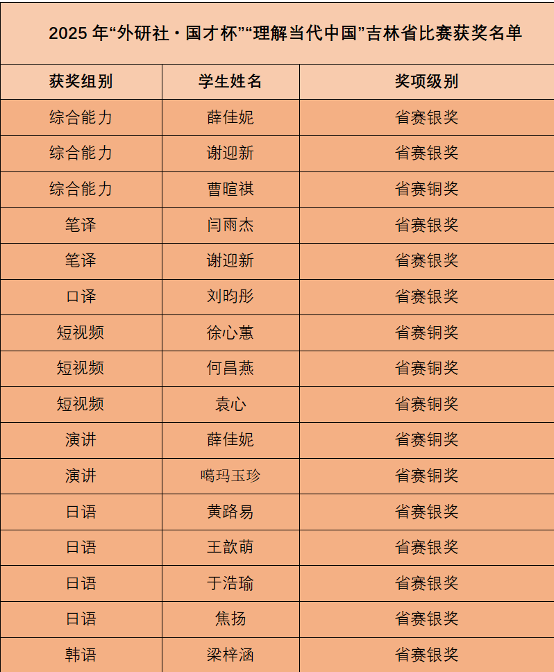 本网讯(语言文化学院 供稿)11月2日,“外研社・国才杯”“理解当代中国”外语能力系列大赛吉林省总决赛落下帷幕,Beat365学子凭借扎实的语言功底、深刻的思辨能力与鲜活的创新表达,在英语组、多语种组两大类别多个赛项中表现出色,共斩获12项银奖、10项铜奖。