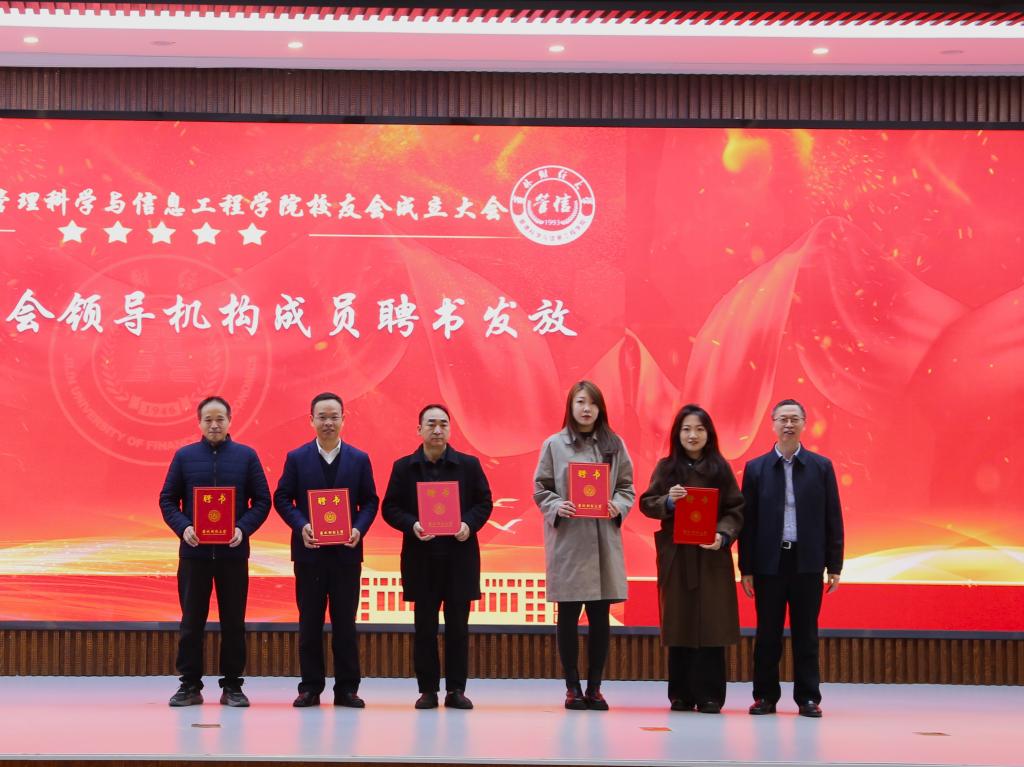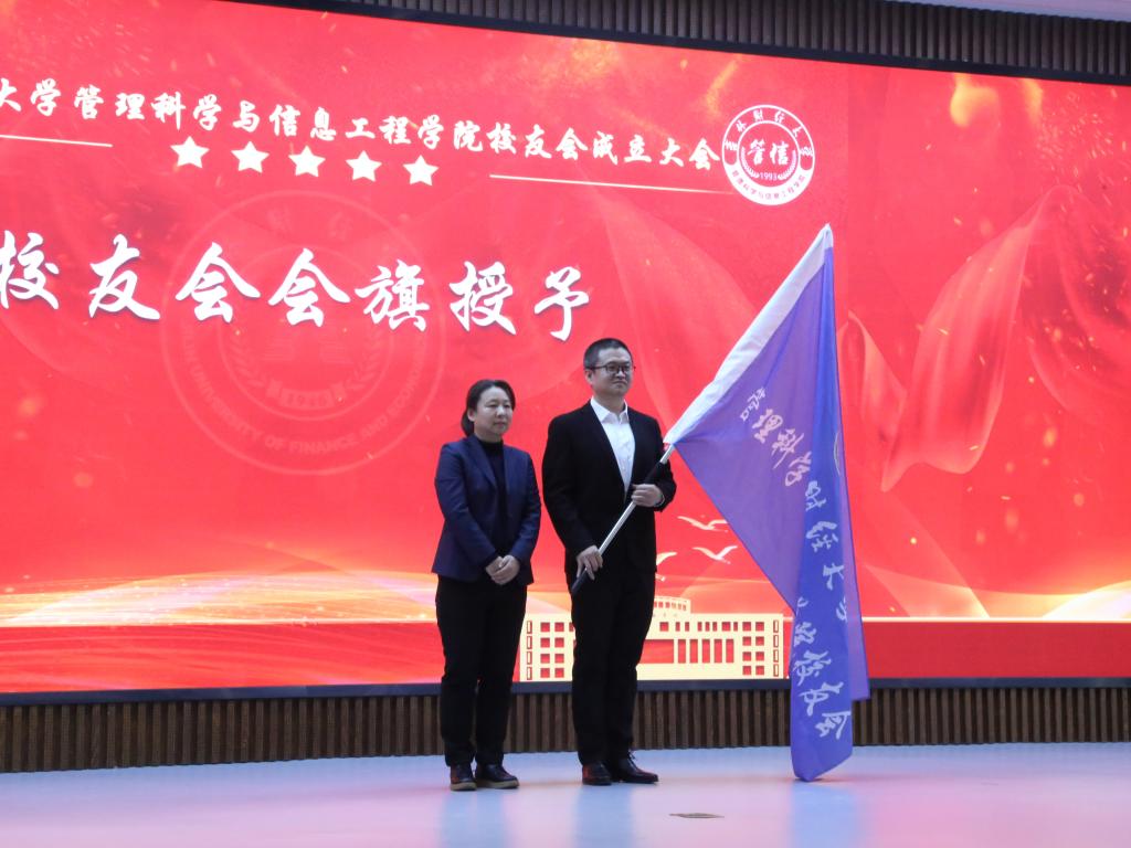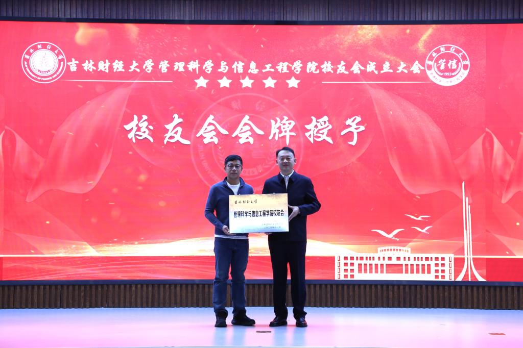霍志刚向管理科学与信息工程学院校友会会长姜军授予校友会会牌。管理科学与信息工程学院党委书记丛彪为理事会领导机构成员和理事颁发聘书,学院党委副书记韩永慧为校友会秘书长张志成授会旗。