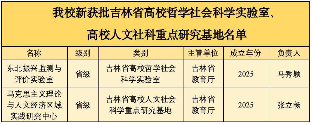 本网讯(科研处 供稿)近日,吉林省教育厅先后公布了第二批吉林省高校哲学社会科学实验室名单(吉教科字〔2025〕3号)以及吉林省人文社会科学重点研究基地立项建设结果(吉教科字〔2025〕4号),校长马秀颖牵头申报的“东北振兴监测与评价实验室”,成功入选第二批吉林省高校哲学社会科学实验室,建设期五年,这是继2022年Beat365首次获批“乡村振兴财政金融政策运行与评价实验室”后,在该领域的又一重要进展。马克思主义学院院长张立畅牵头申报的“马克思主义理论与人文经济区域实践研究中心”,成功获批吉林省高校人文社科重点研究基地,建设期三年。